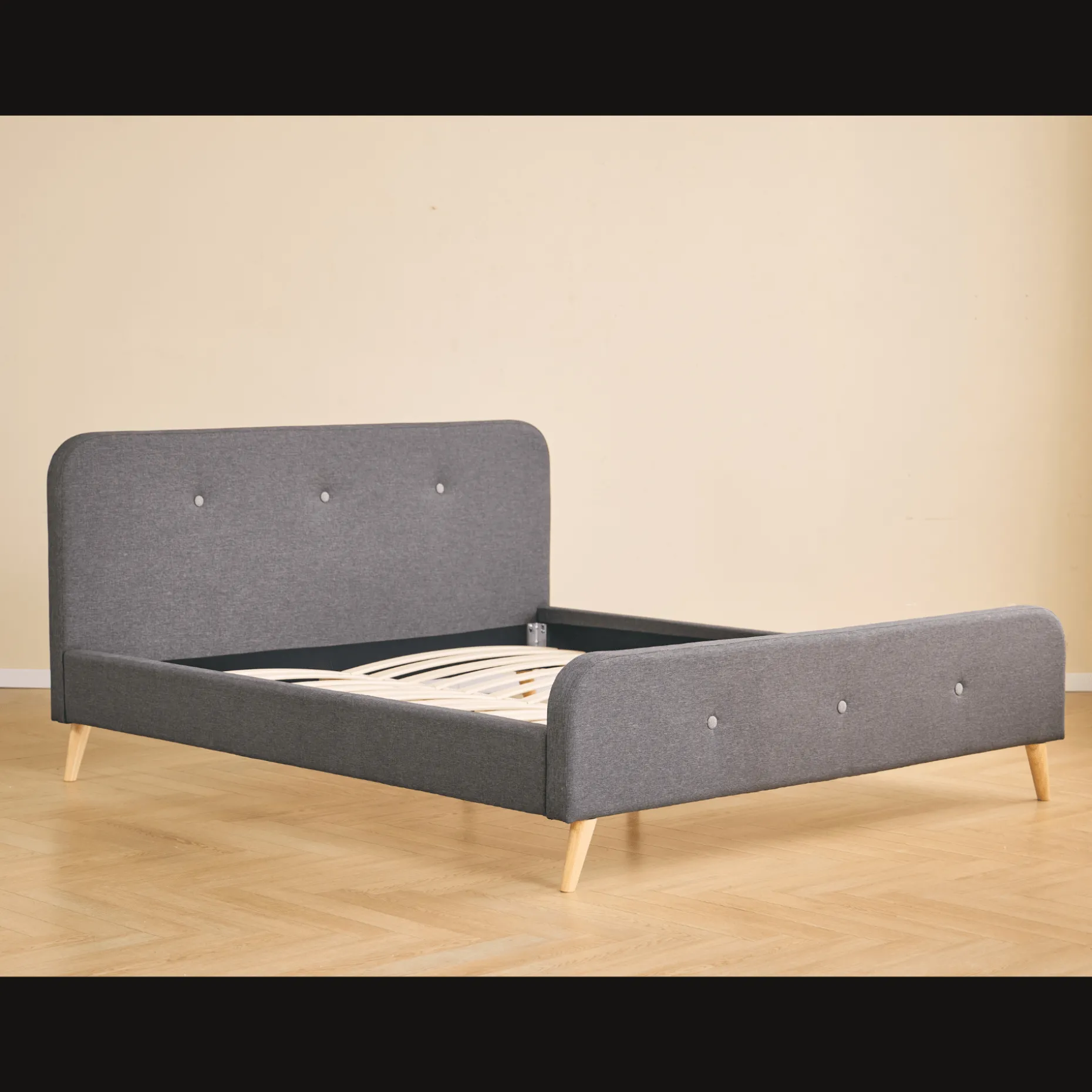 Giv dit soveværelse et stilrent og moderne udtryk med denne sengeramme med knapdetaljer. Sengerammen er betrukket med behageligt tekstil og står stabilt på solide træben, der giver et naturligt og skandinavisk præg til udtrykket.