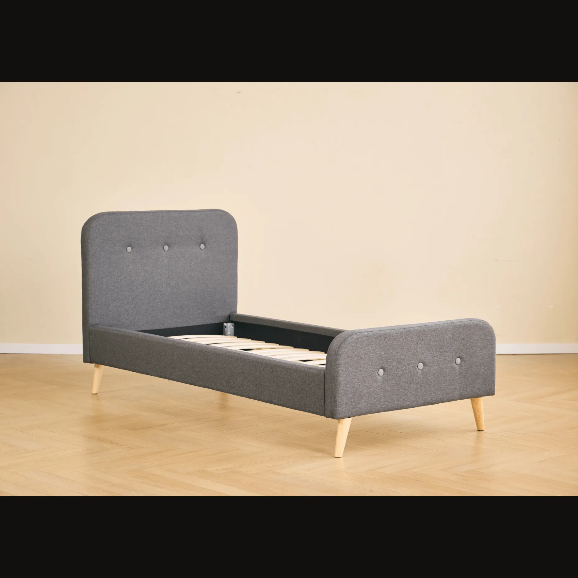 Giv dit soveværelse et stilrent og moderne udtryk med denne sengeramme med knapdetaljer. Sengerammen er betrukket med behageligt tekstil og står stabilt på solide træben, der giver et naturligt og skandinavisk præg til udtrykket.