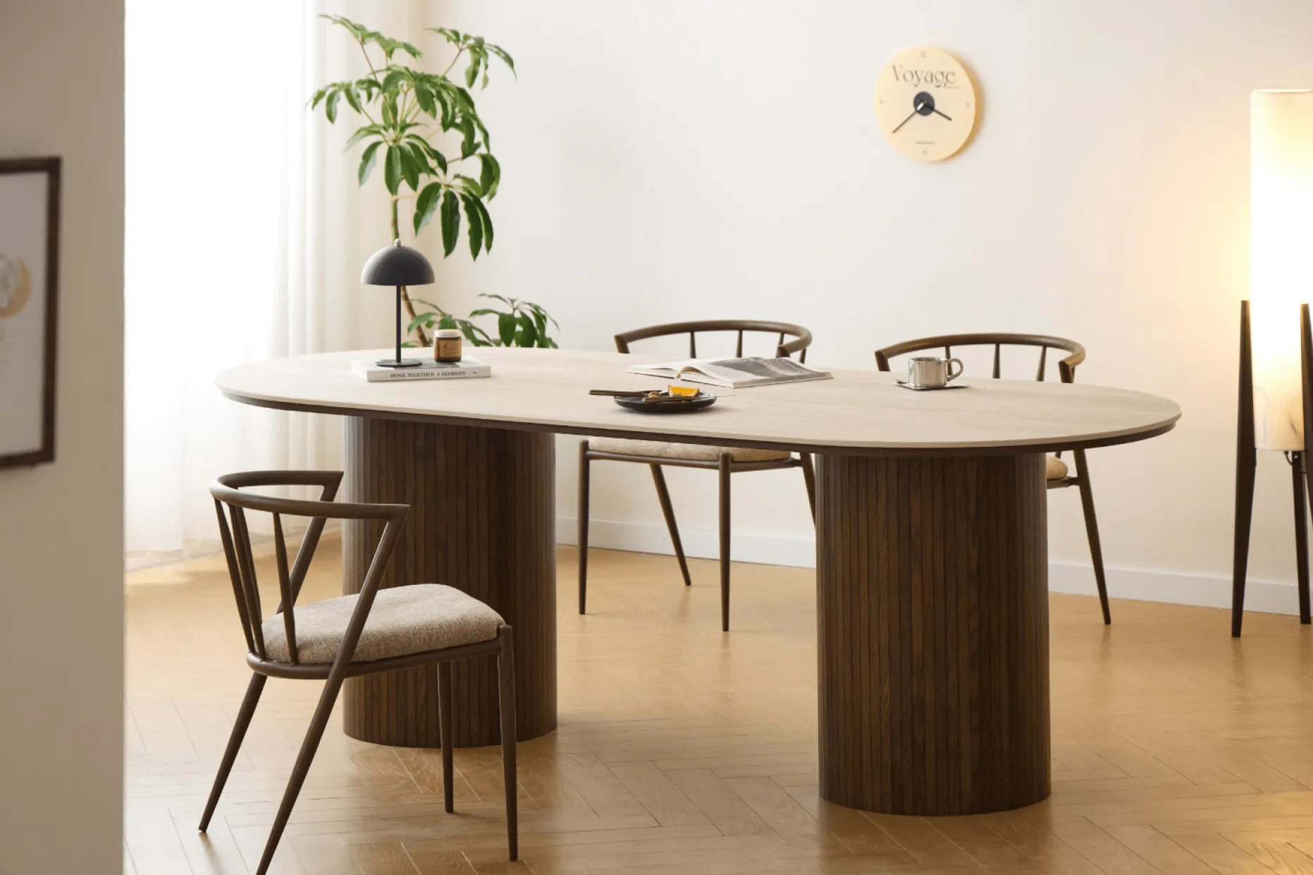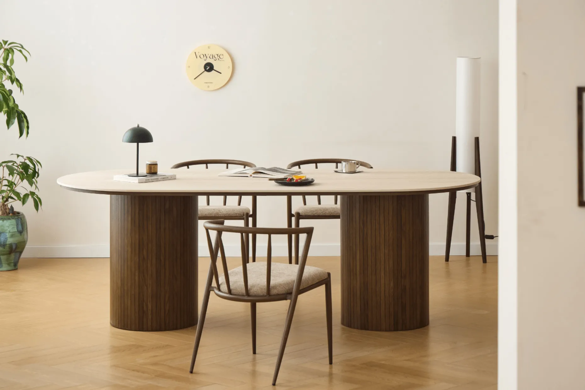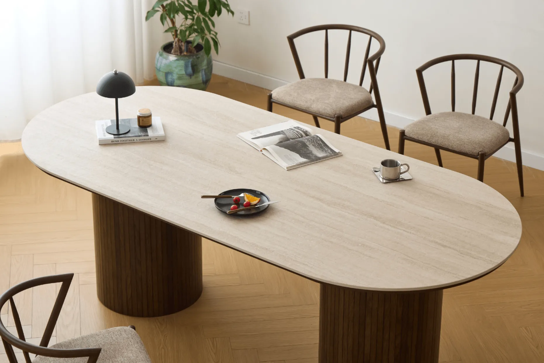 Vores Enzo spisebord med en elegant beige stenbordplade og lamelfod i røget eg er det ideelle valg til dig, der ønsker et stilrent og eksklusivt spisebord med god plads. Det ovale design skaber et let og harmonisk udtryk, som gør bordet velegnet til både større og mere åbne rum.