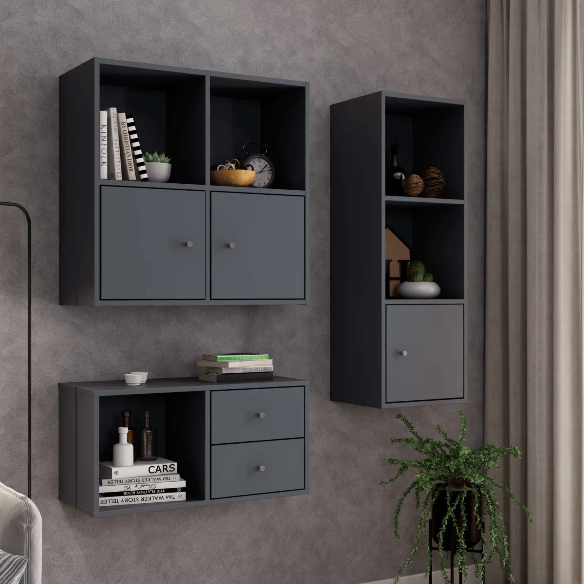 Flora grå skuffer til vores væghængte reolsystemer.
