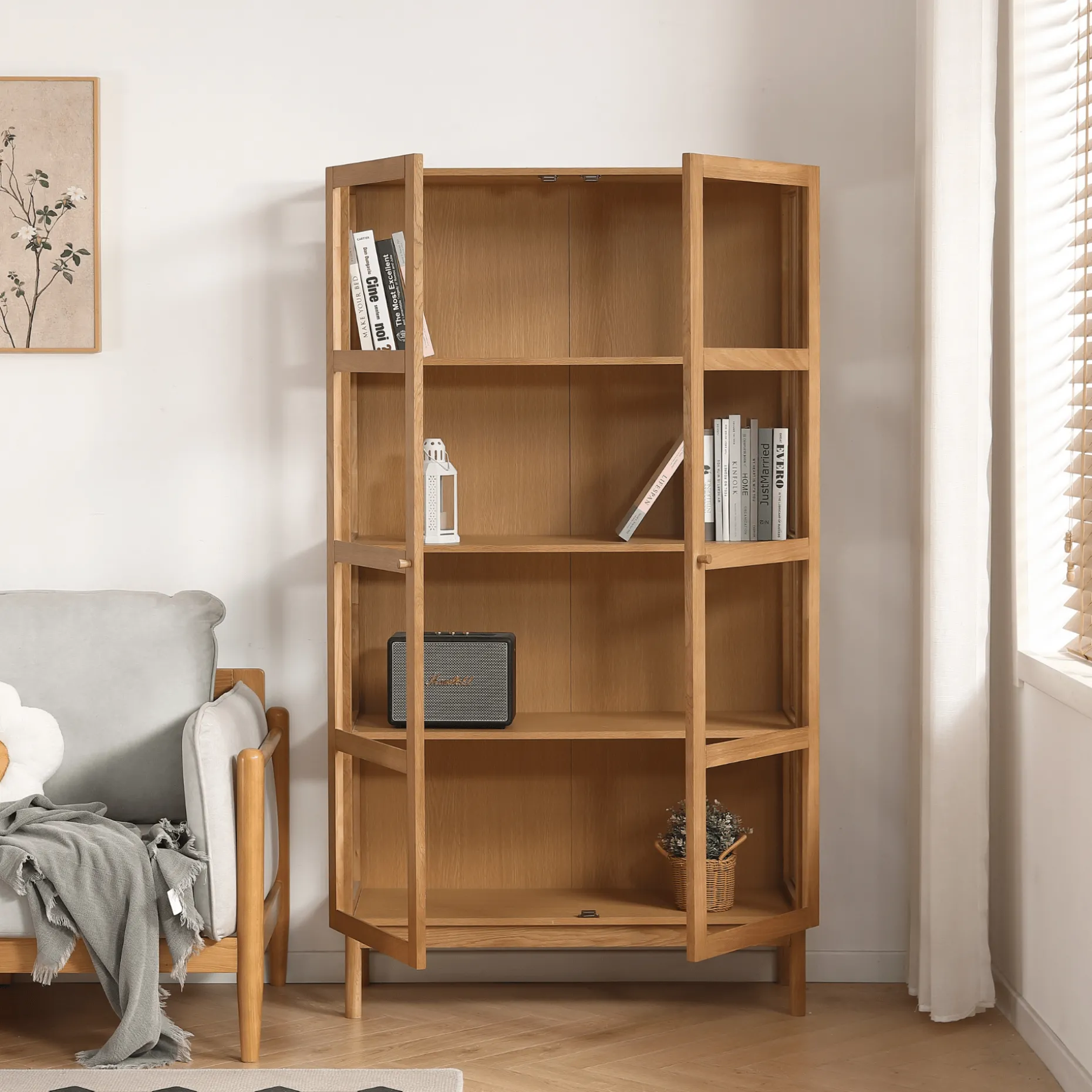 Indretningen med flere hylder giver dig god plads til opbevaring og udstilling, mens den solide trækonstruktion sikrer lang holdbarhed. Et tidløst møbel, der skaber ro og orden i rummet.