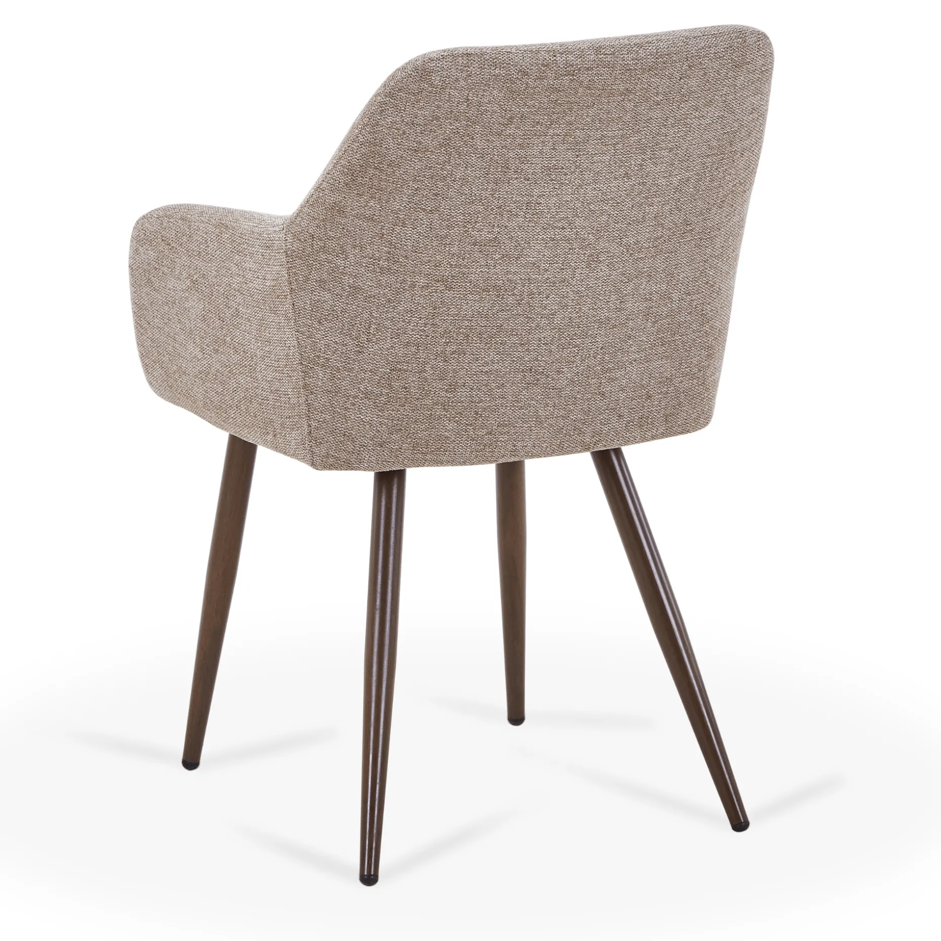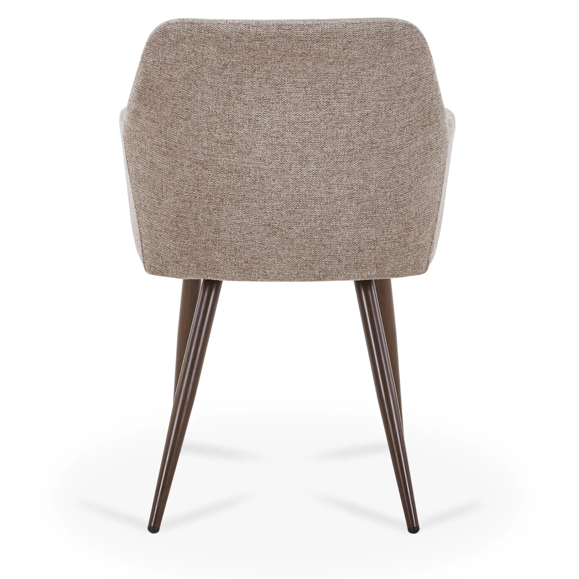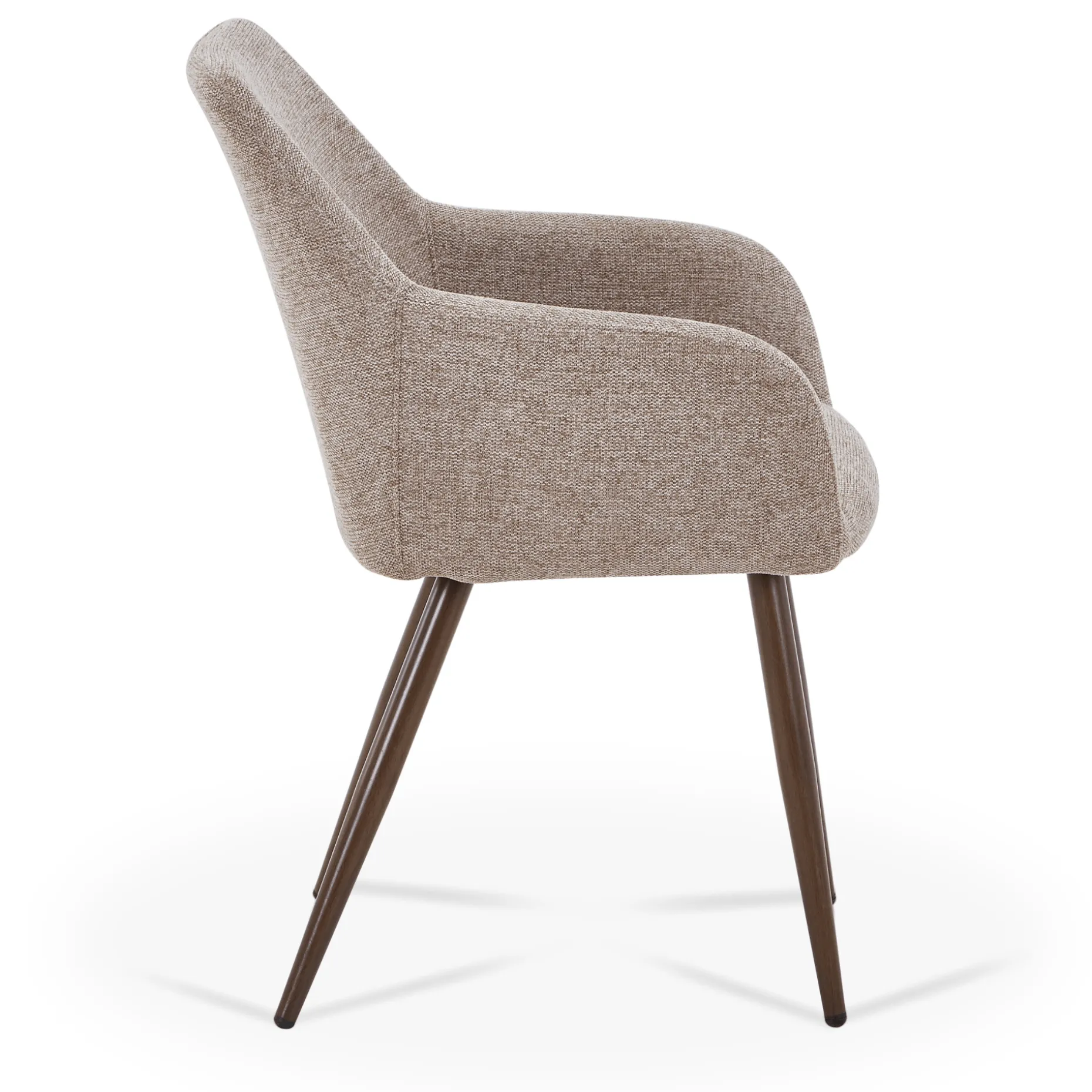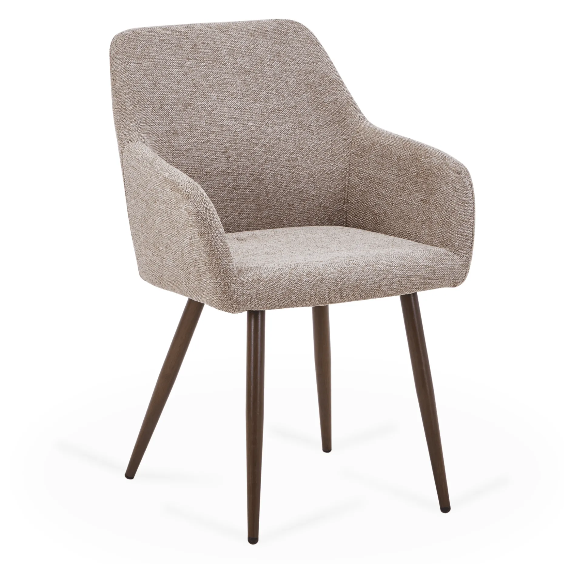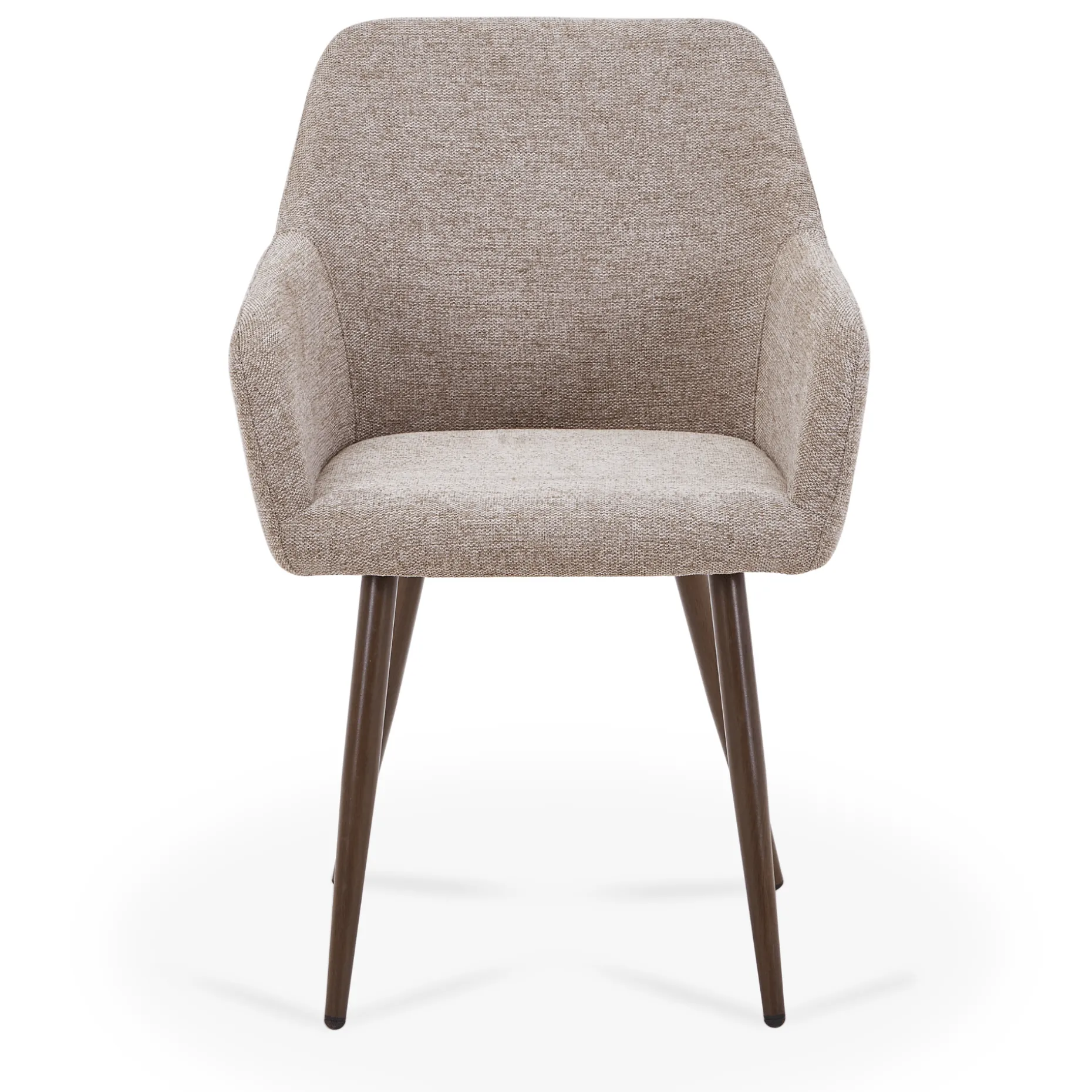 Denne polstrede stol med armlæn er lavet til dig, der gerne vil sidde godt uden at gå på kompromis med stilen. Den bløde sandfarvede tekstil giver et varmt og roligt udtryk, og sædet er dejligt behageligt – perfekt til lange middage eller hyggelige stunder ved bordet.