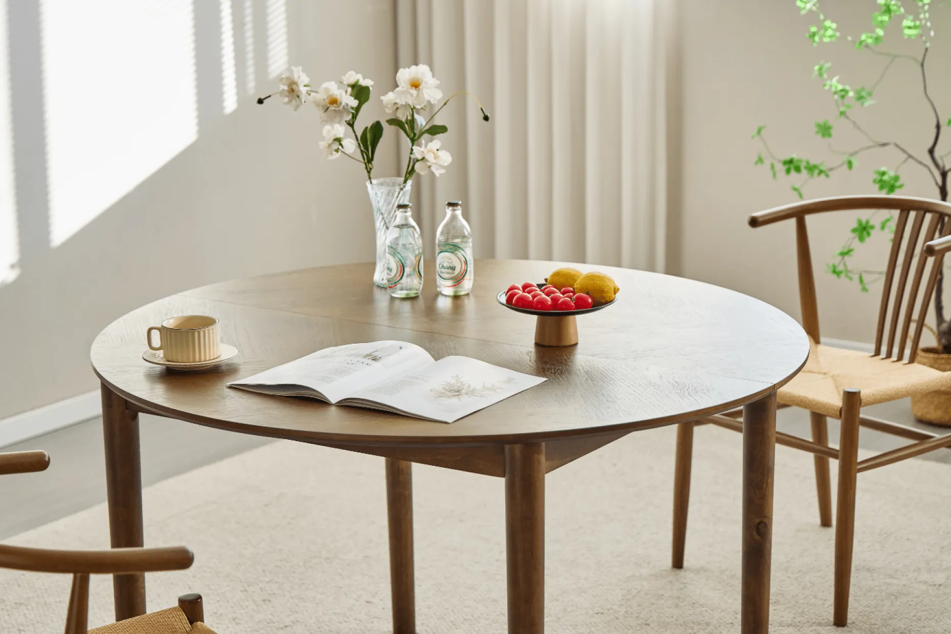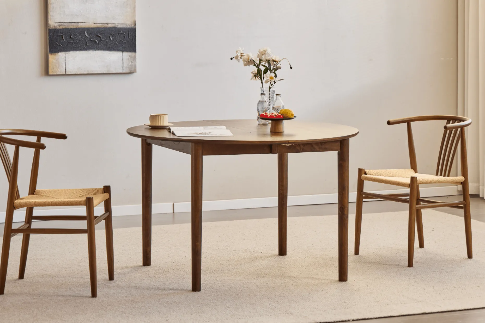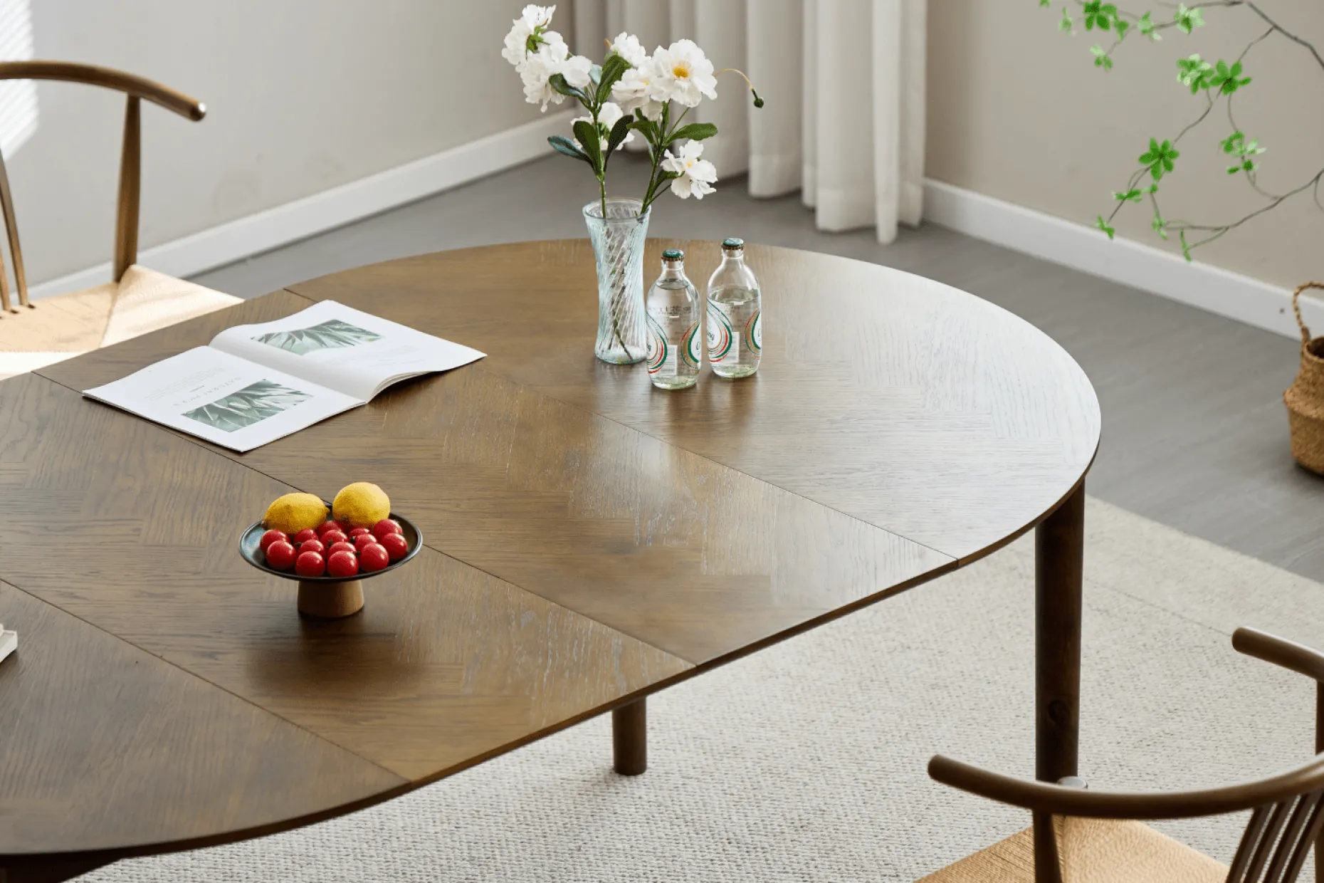 Rundt spisebord med udtræk og sildebensmønster