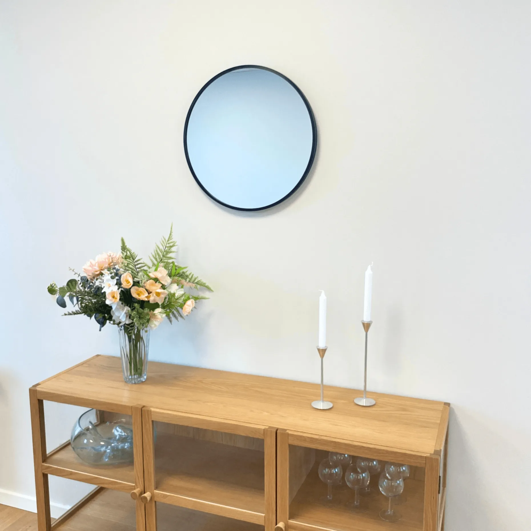 Spejlets nøglefunktion er dens sorte ramme, som ikke blot giver en robust konstruktion, men også en slående visuel appel. Med en diameter på 50 cm er spejlet ideelt dimensioneret til at tjene som et elegant fokuspunkt i ethvert rum, fra stuen til soveværelset eller endda i entréen.