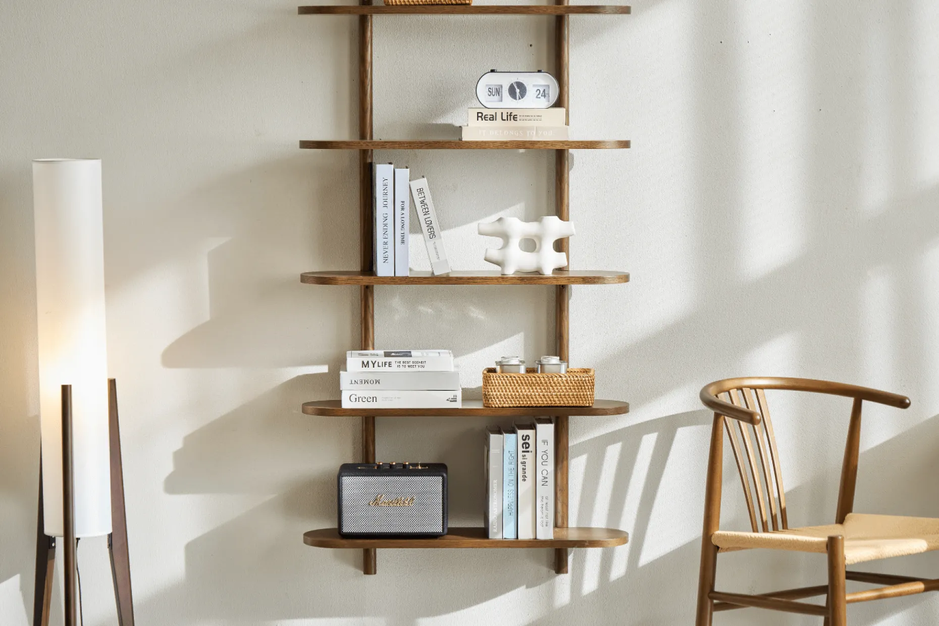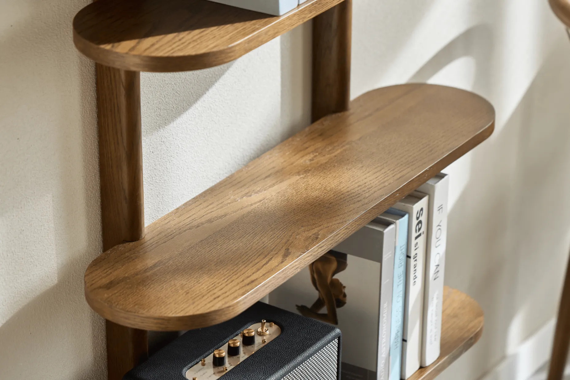 Skab et elegant og roligt udtryk i hjemmet med Juliet væghylde. De fem rummelige hylder giver dig god plads til at udstille dine yndlingsdekorationer, bøger og billeder, mens det minimalistiske design med bløde, afrundede hjørner og den naturlige egetræsoverflade tilfører varme og karakter til rummet. Juliet væghylde kombinerer funktionalitet og æstetik, perfekt til dig, der ønsker et enkelt og stilrent hjem.