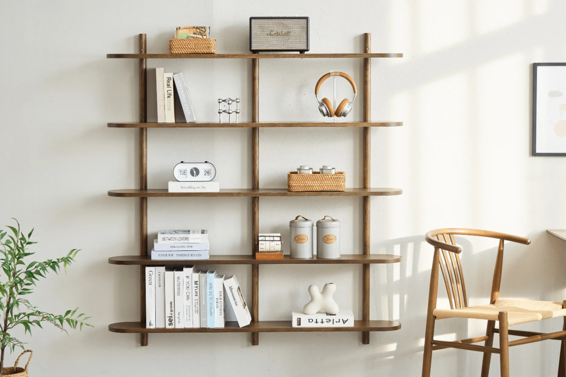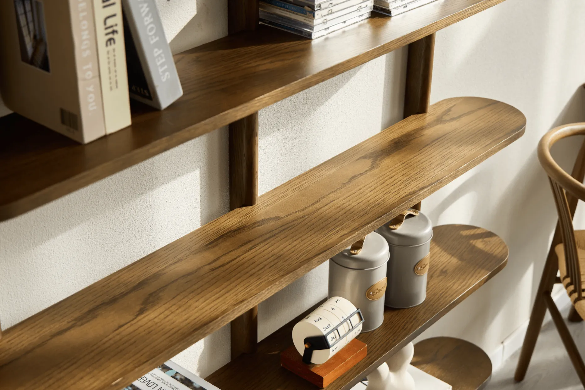 Skab et elegant og roligt udtryk i hjemmet med Juliet væghylde. De fem rummelige hylder giver dig god plads til at udstille dine yndlingsdekorationer, bøger og billeder, mens det minimalistiske design med bløde, afrundede hjørner og den naturlige egetræsoverflade tilfører varme og karakter til rummet.