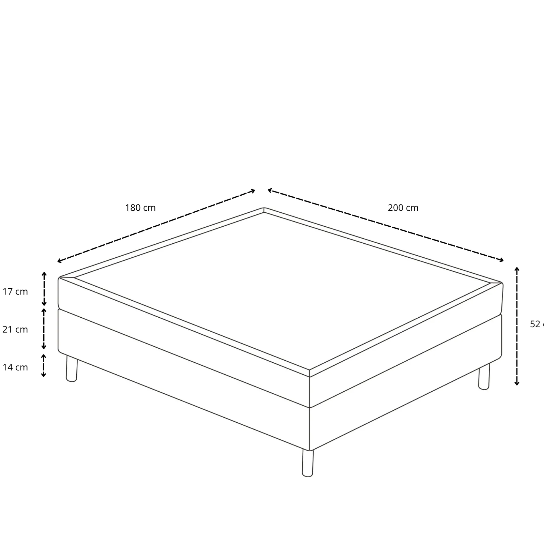 | Materiale – Boxmadras | • PU-skum • Pocketfjedre • Betrukket med strikstof (220 g) og vævet stof (365 g) • Aftageligt og vaskbart betræk |