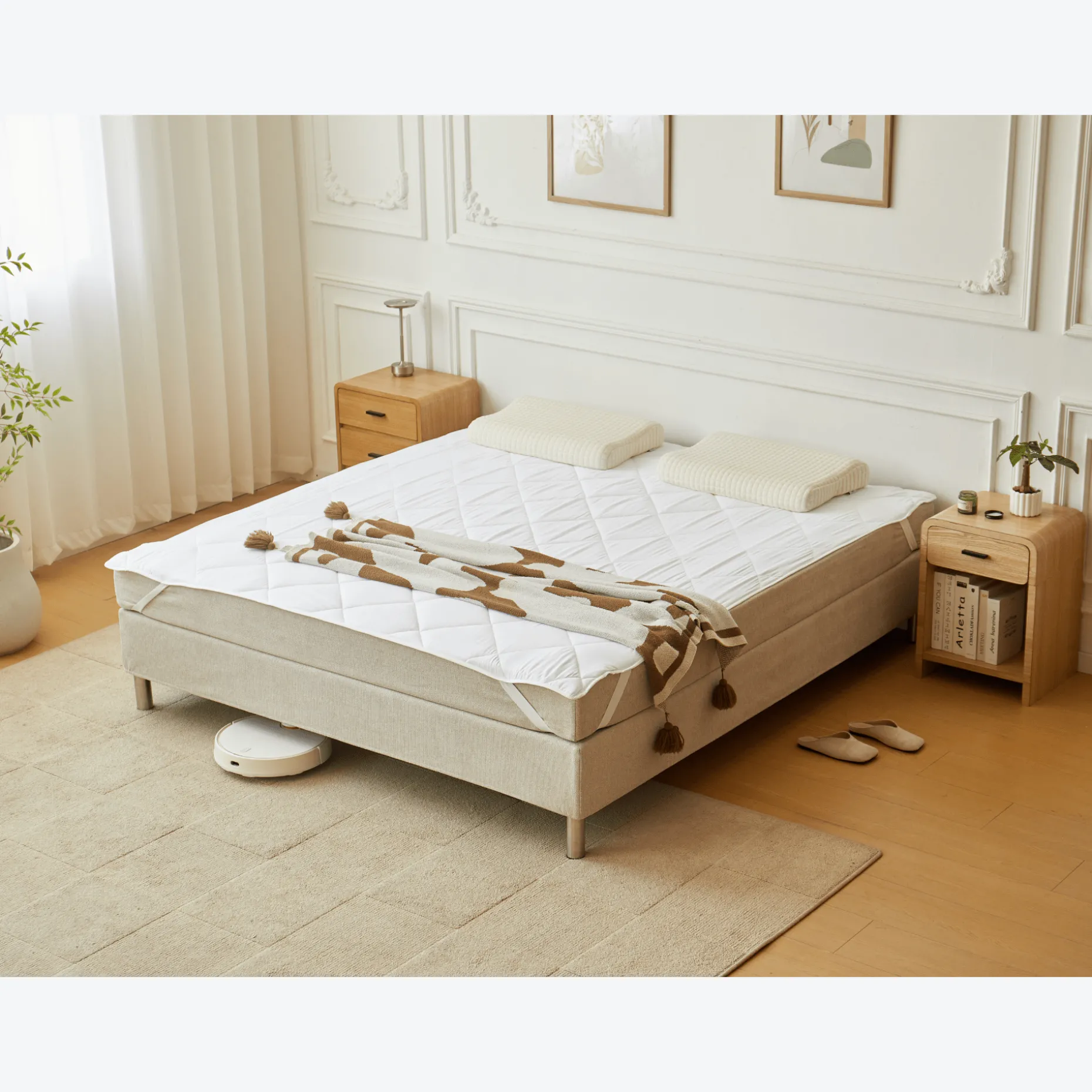 Opgrader din sovekomfort med denne quiltede hvide rullemadras, det ideelle valg til at beskytte din madras og give et ekstra lag blødhed.