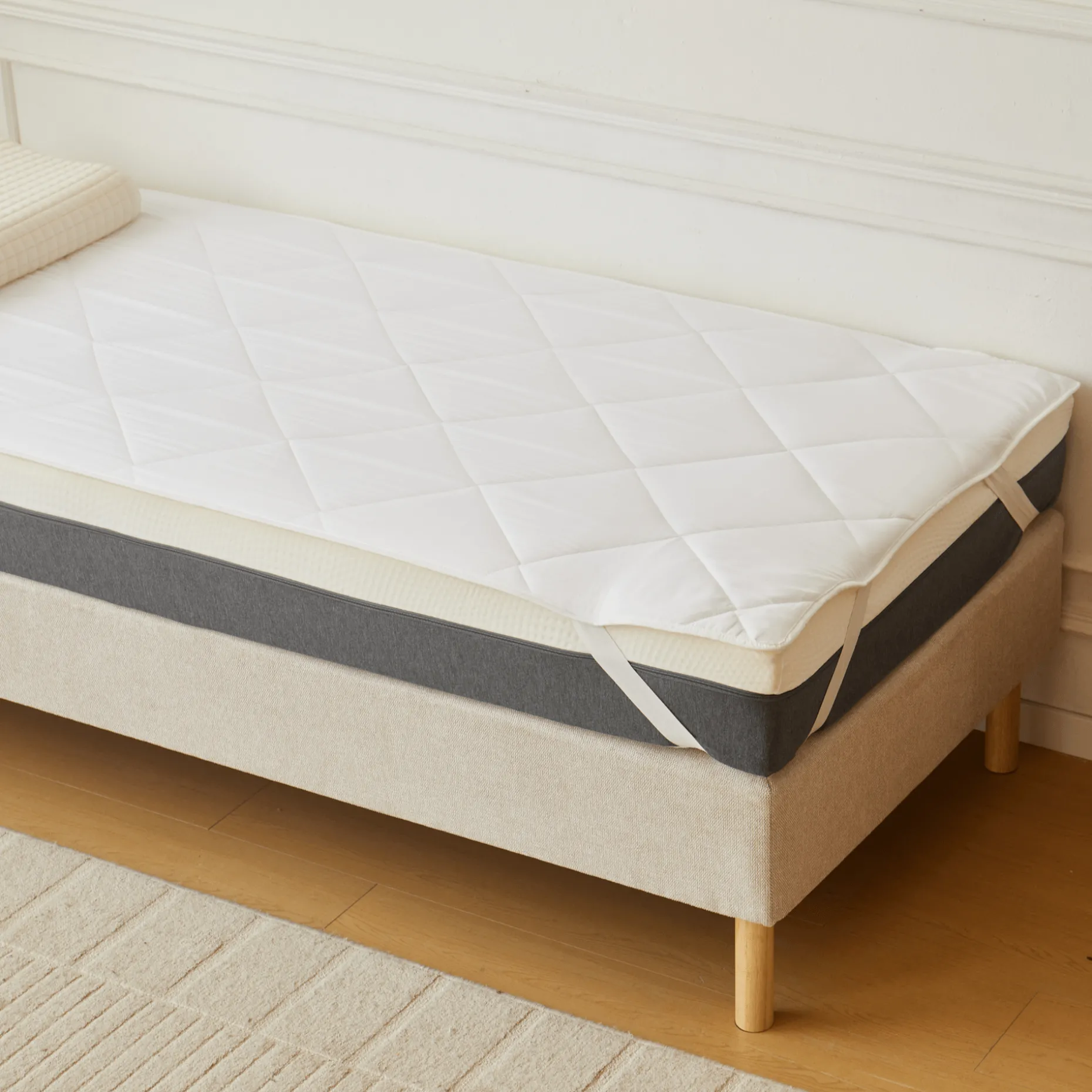 | Materiale | • Polyesterfiberfyld (quiltet for jævn fordeling og formstabilitet) • Elastikstropper i hjørnerne (sikrer korrekt placering) |