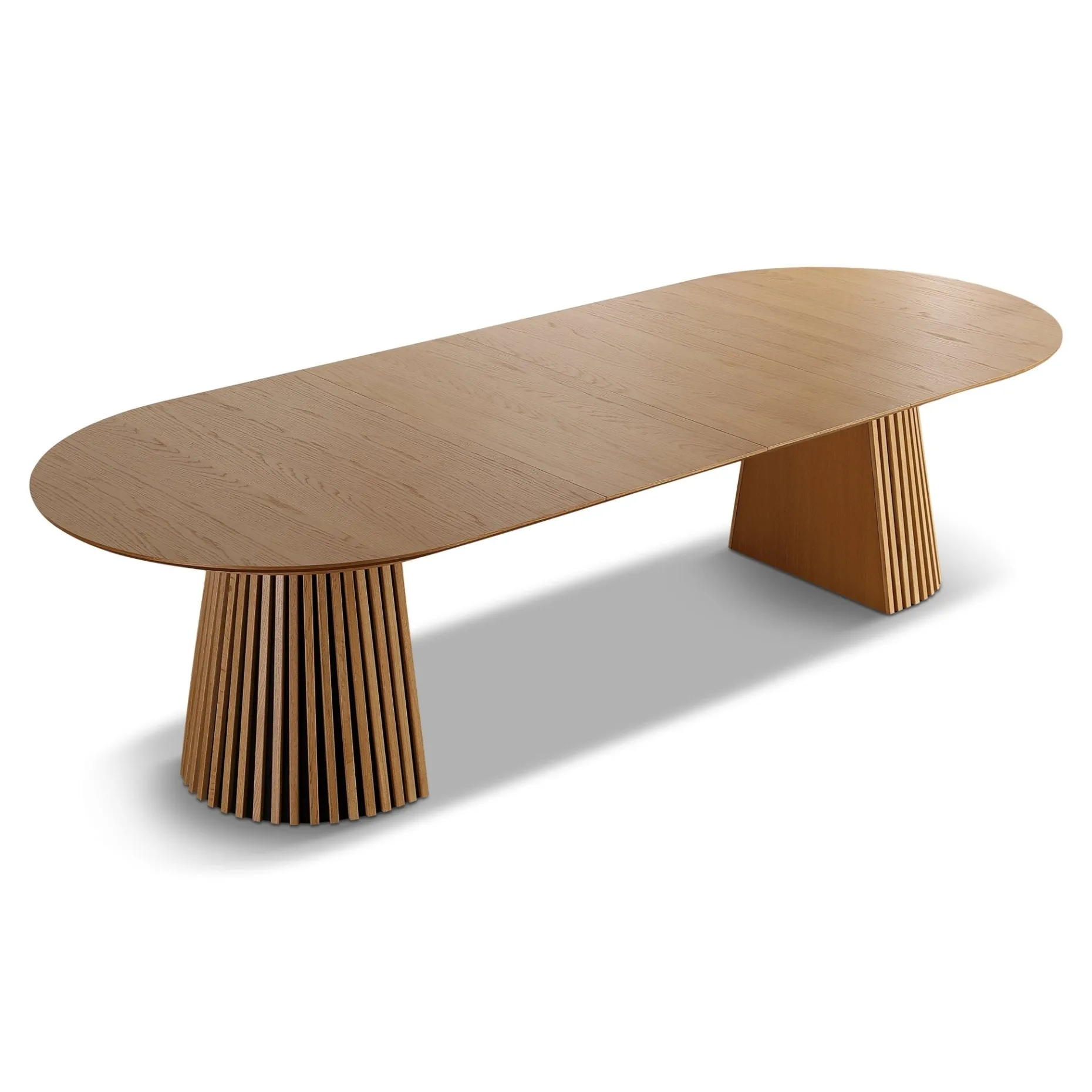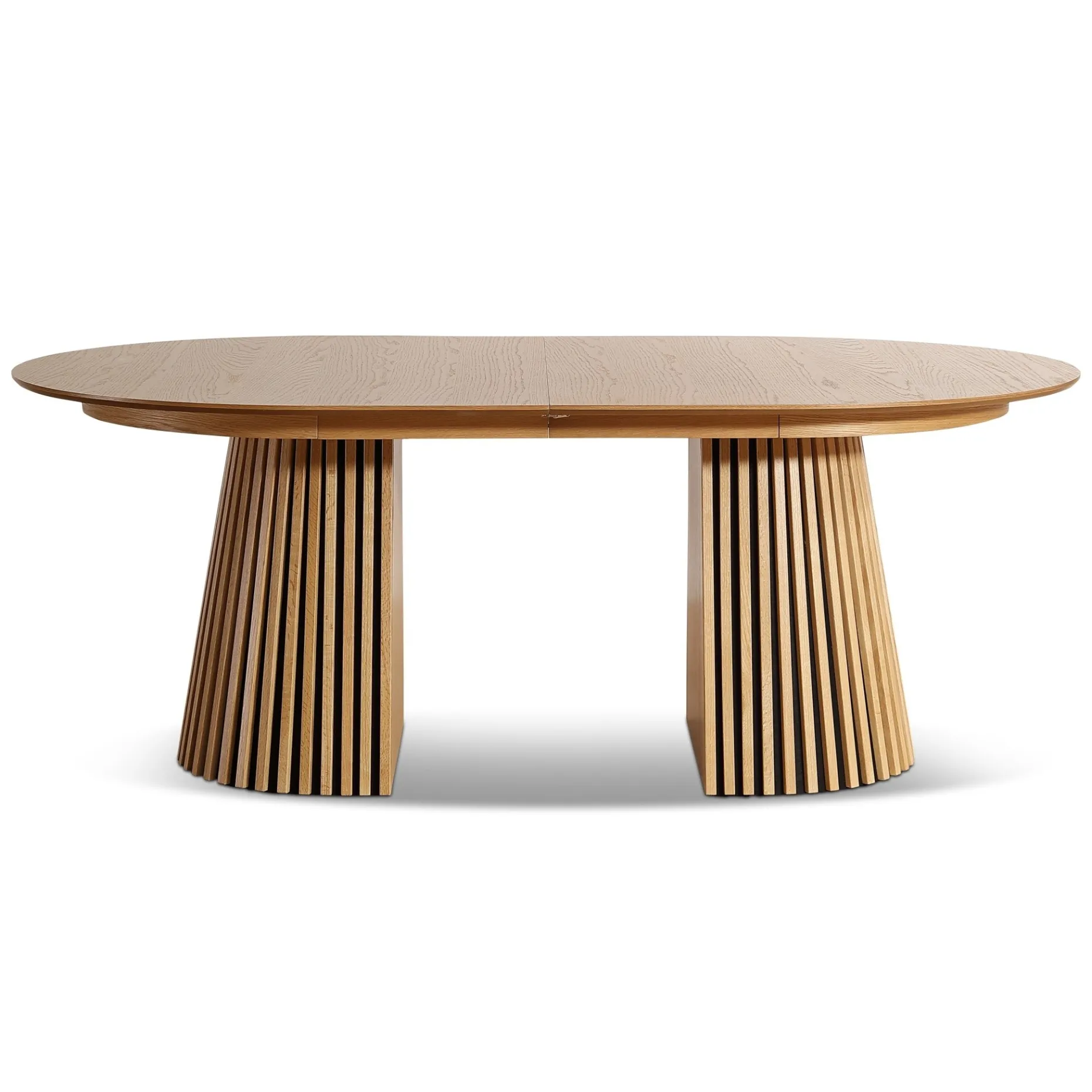 Det her bord rammer en perfekt balance mellem stil og funktion. Den ovale bordplade i egefiner giver et blødt og indbydende udtryk, mens de markante lamelfødder sætter et moderne og karakterfuldt præg på rummet.