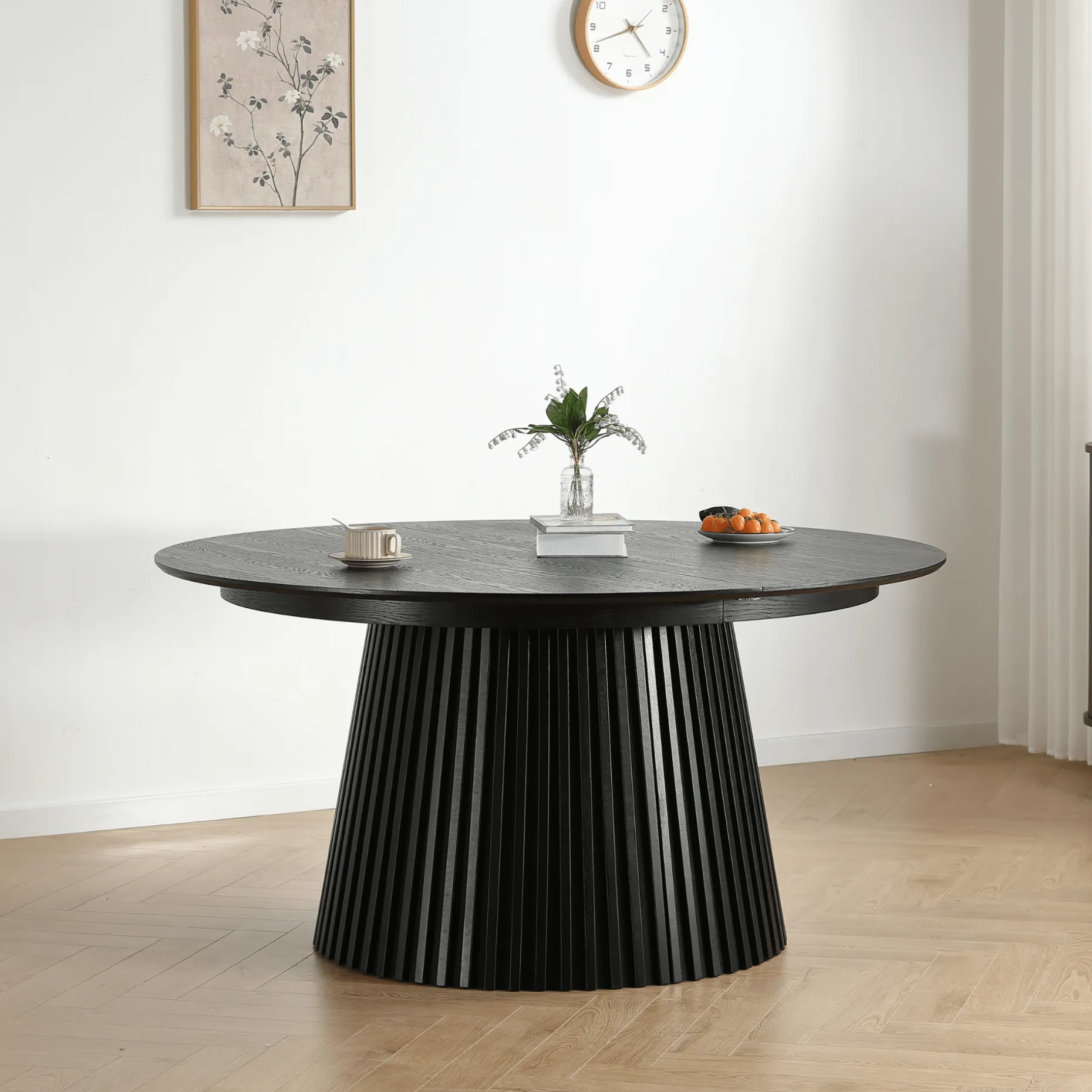 Har du brug for et bord, der passer godt til mindre rum uden at fylde for meget i hverdagen, samtidig med at der stadig er god plads til gæster? Så er Lewis lamel spisebord i sort egefiner det perfekte valg. Dette runde bord er skræddersyet til rum, hvor pladsen er knap, men udtrækket giver dig alligevel rig mulighed for at byde flere velkommen.