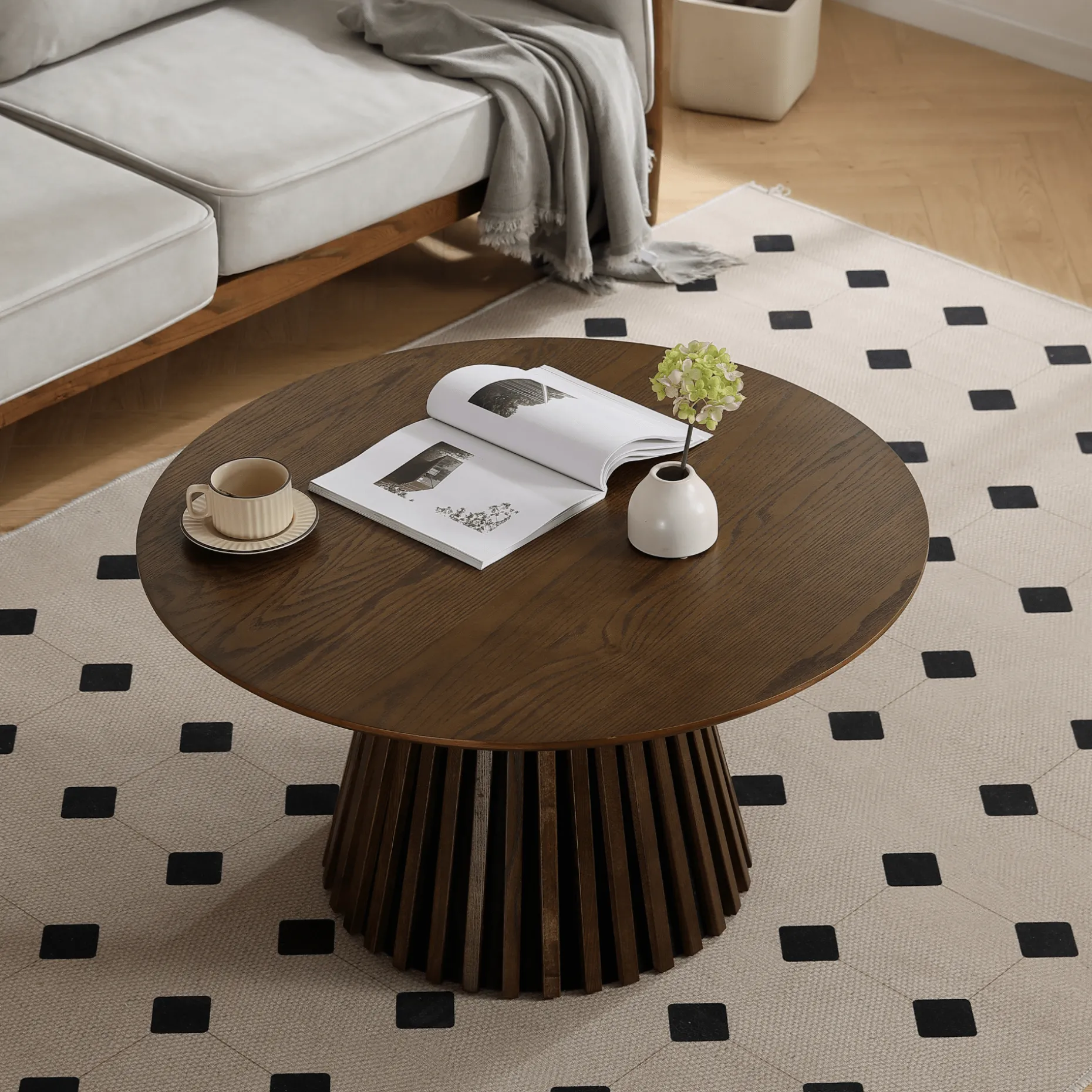 Den runde bordplade i egefiner giver et blødt og indbydende udtryk, mens den karakteristiske lamelfod giver et moderne præg.
