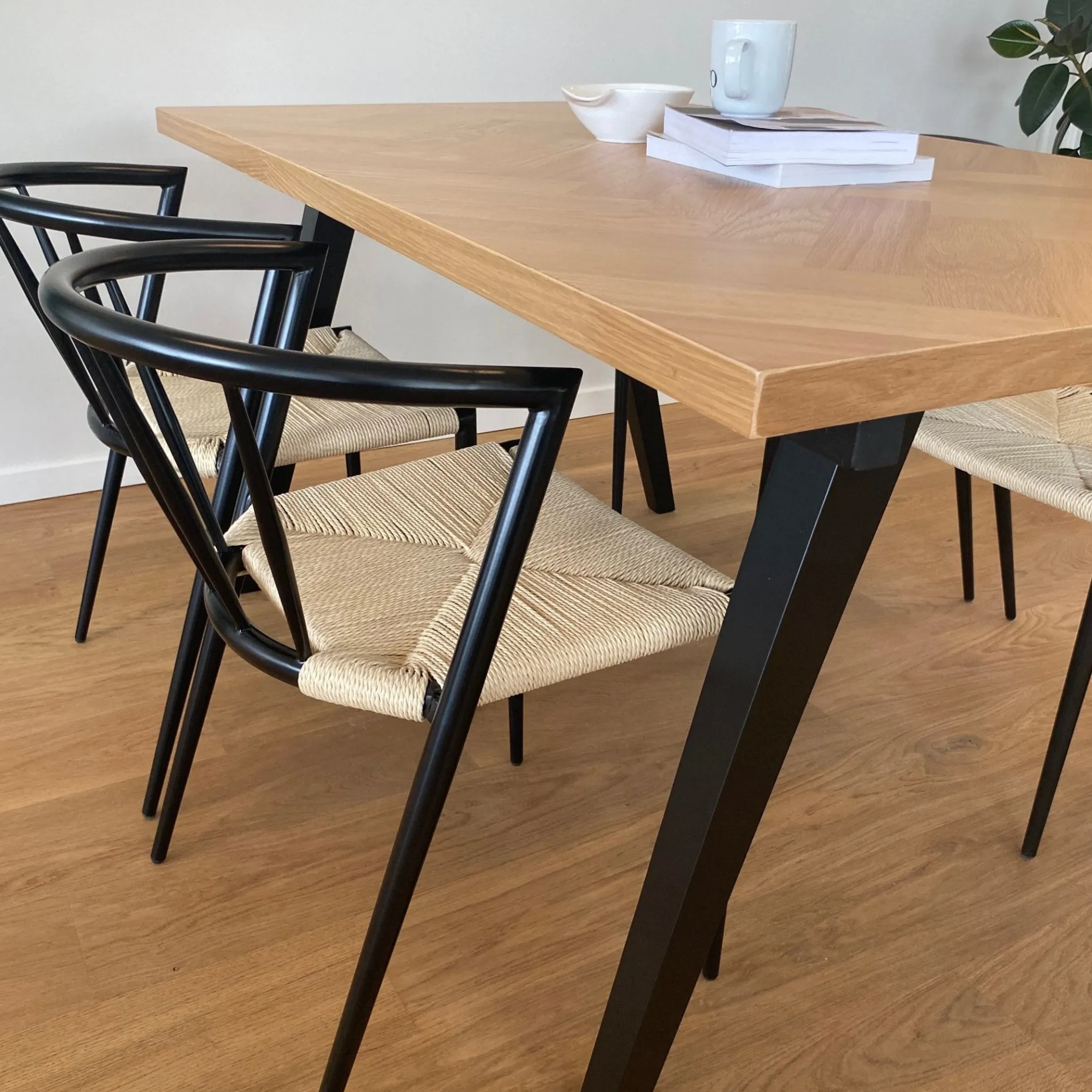 Vores Madelina spisebord med sorte træben måler 150 cm i længden, hvilket giver plads til at have 2 stole stående på hver side.