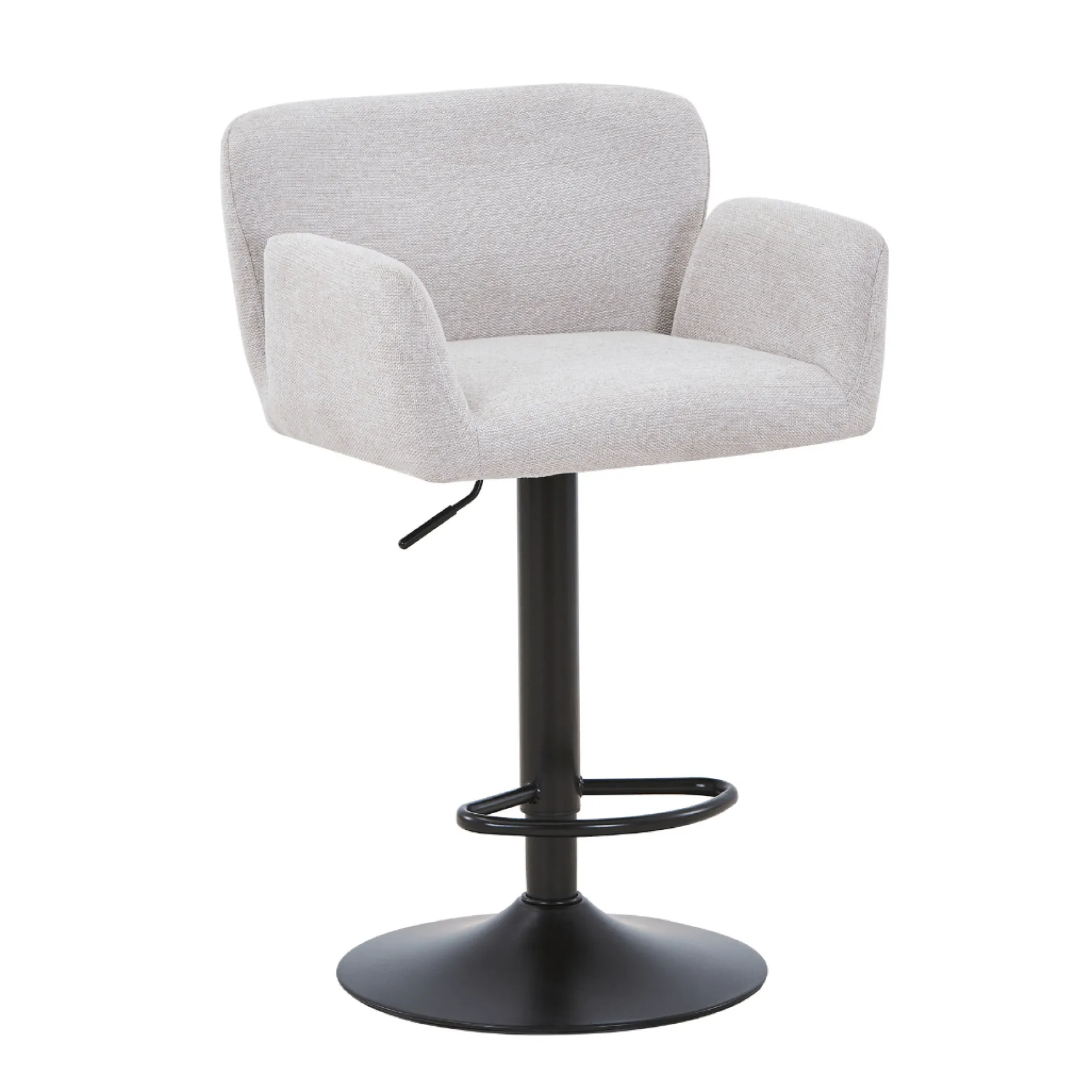 Melody barstol i beige tekstil har et stilrent og moderne design, der kombinerer komfort og funktionalitet. Den polstrede sædehynde og de afrundede armlæn giver optimal støtte, mens den justerbare højde og fodstøtte sikrer en behagelig siddeoplevelse. Med en sort metalbase tilføjer stolen et elegant og tidløst udtryk, perfekt til køkkenøen eller hjemmebaren.