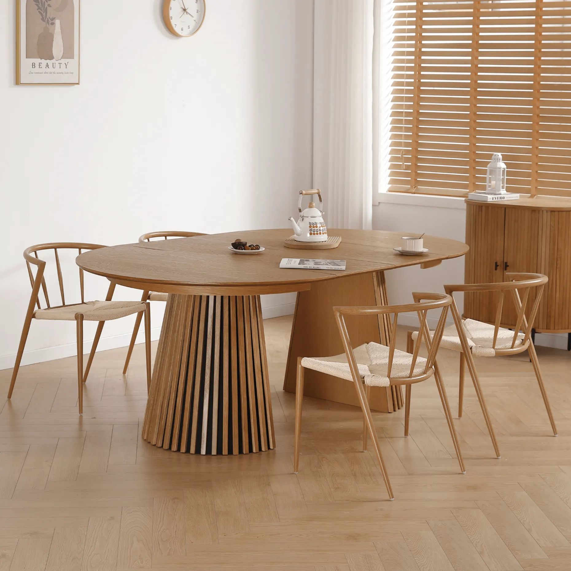 Et stilrent og praktisk spisebordssæt i varme trætoner. Lewis spisebordet er udført i naturlig egefiner og har et karakteristisk lameldesign, der tilføjer kant og karakter. Med to medfølgende tillægsplader kan bordet udvides fra 120 til hele 200 cm.