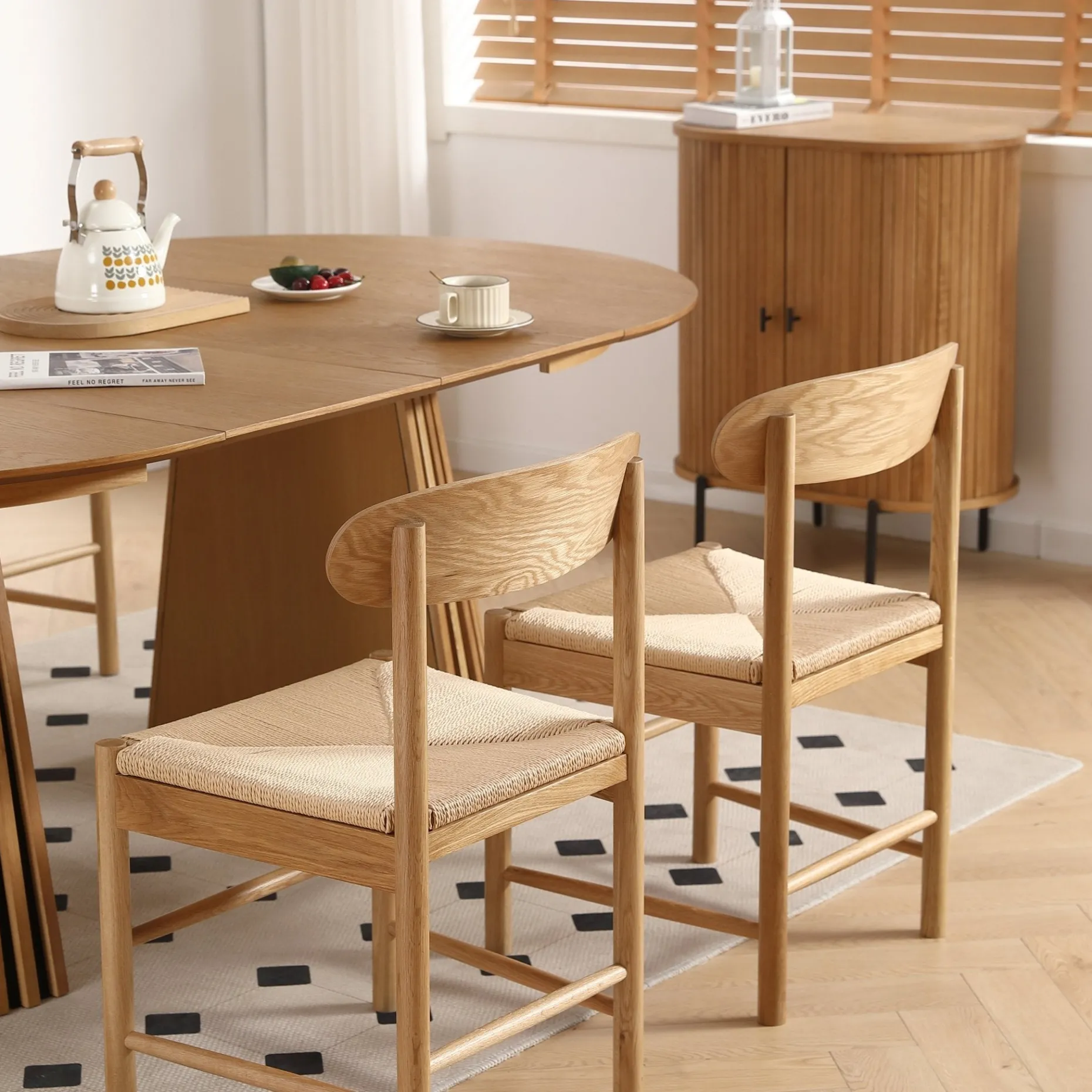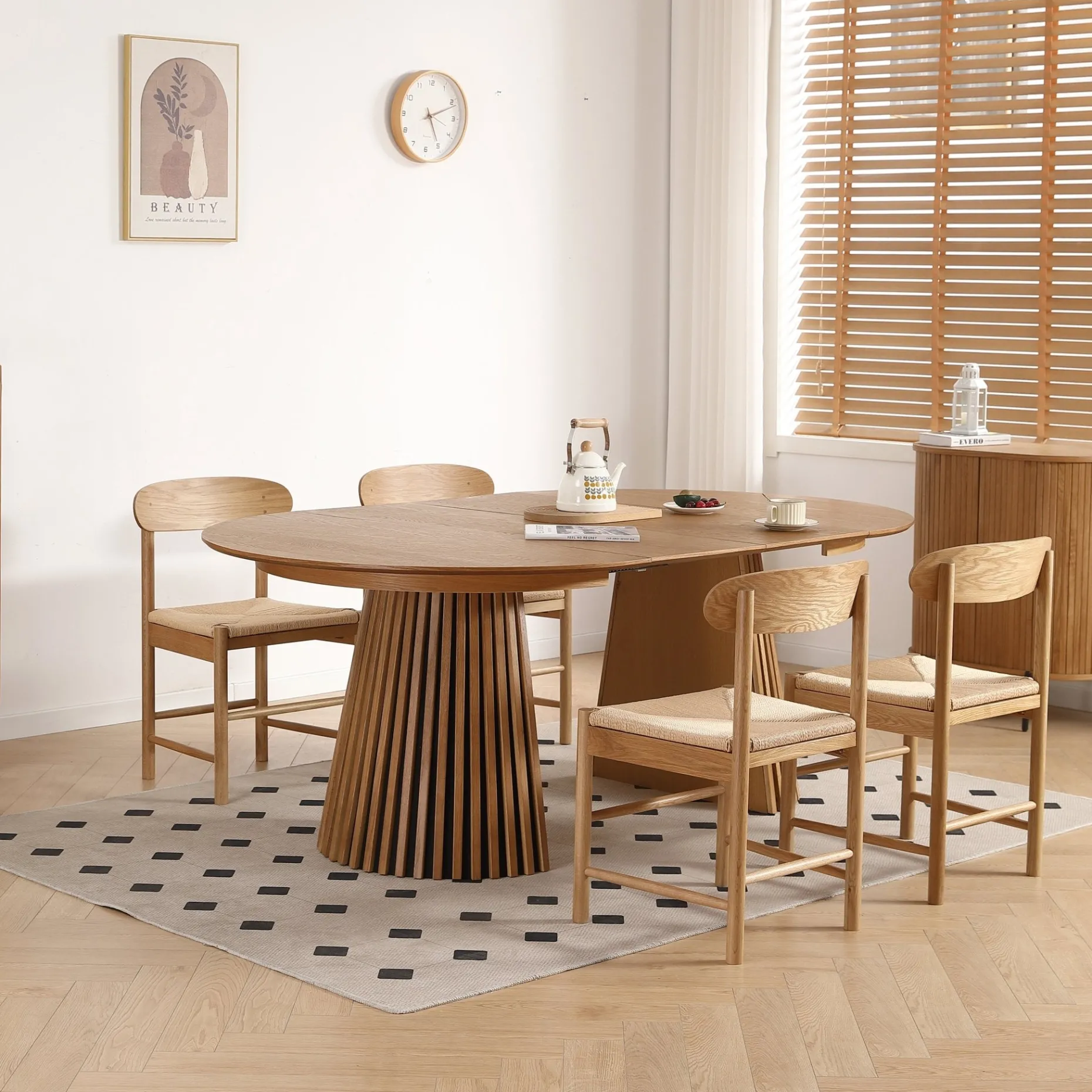 Et stilrent og praktisk spisebordssæt i varme trætoner. Lewis spisebordet er udført i naturlig egefiner og har et karakteristisk lameldesign, der tilføjer kant og karakter. Med to medfølgende tillægsplader kan bordet udvides fra 120 til hele 200 cm.