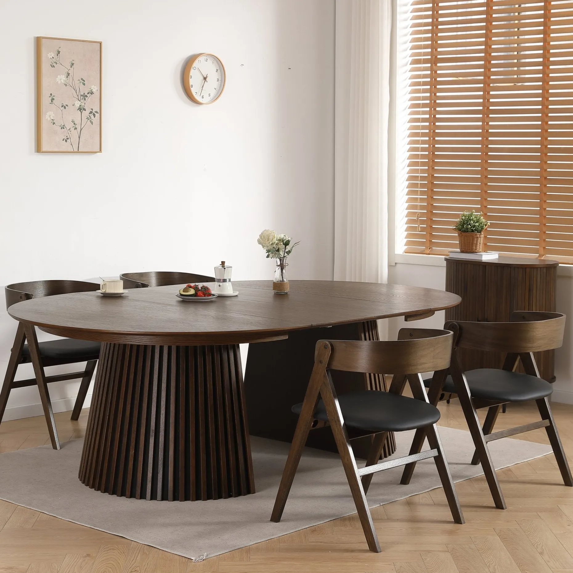 Lewis spisebordet i røget egefiner har en kompakt størrelse på 120 cm, men kan nemt udvides til 160 eller 200 cm med de to medfølgende tillægsplader – ideelt til både hverdagsmåltider og hyggelige middage med gæster.