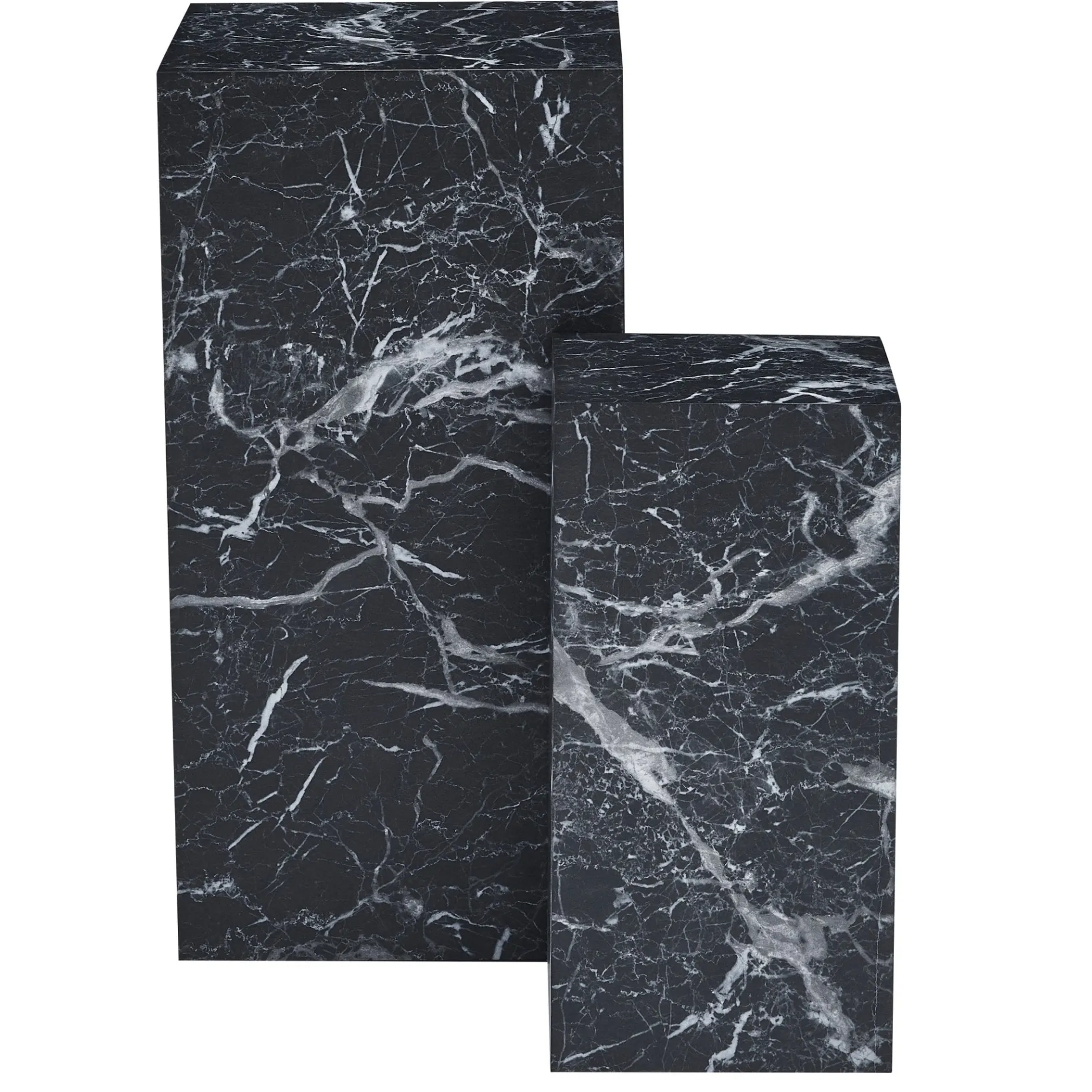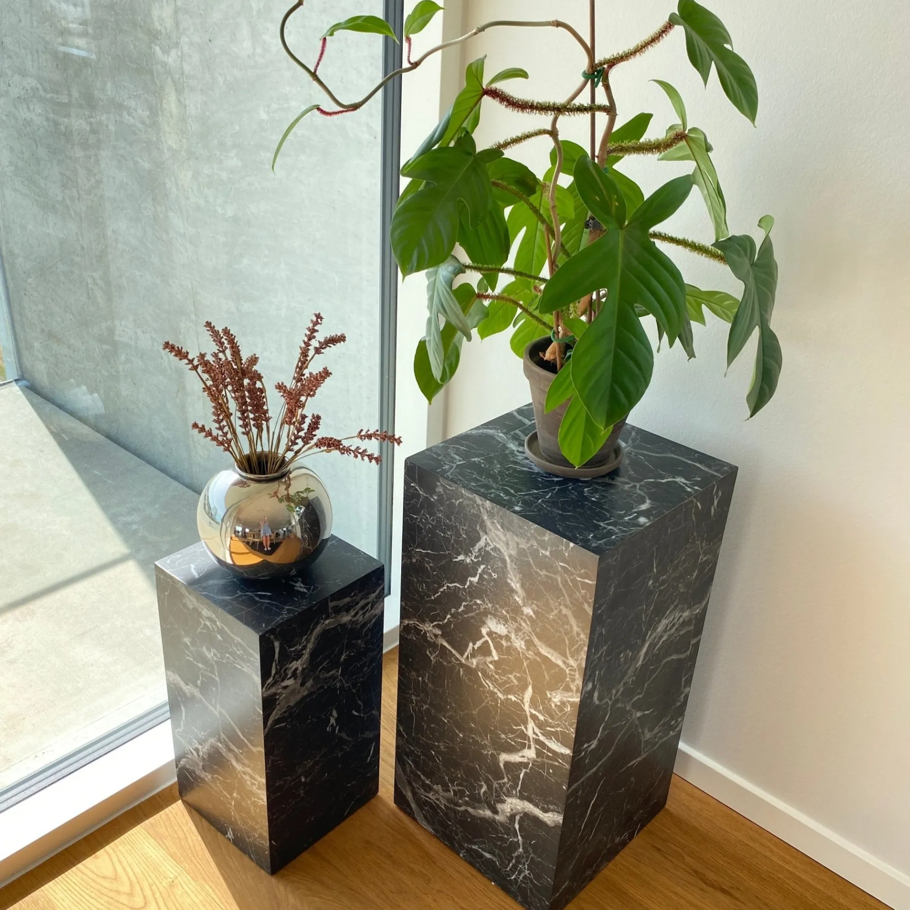 Vores Adele piedestaler er i et elegant mat marmor look der tilføjer en sofistikeret og stilfuld touch til enhver indretning. Piedestalen har en smuk sort farve og fås også i hvid med naturlige årer, der skaber en smuk og unik struktur. Søjlerne er kvadratiske og er ideel til at have blomstervaser, lampe eller en dekorativ genstand stående på.