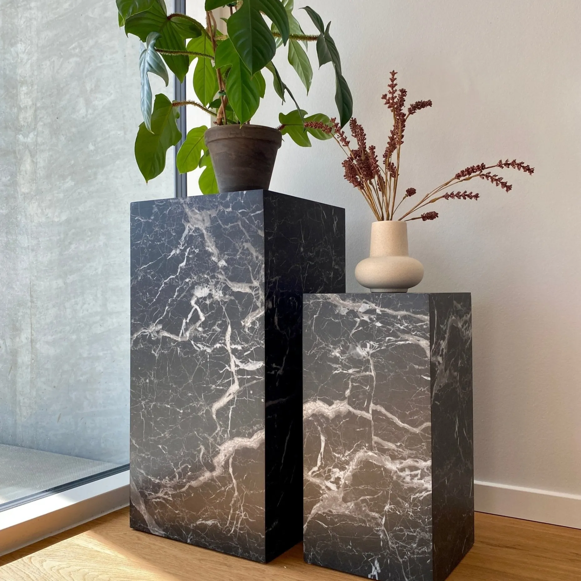 Elegante piedestaler i mat marmor look