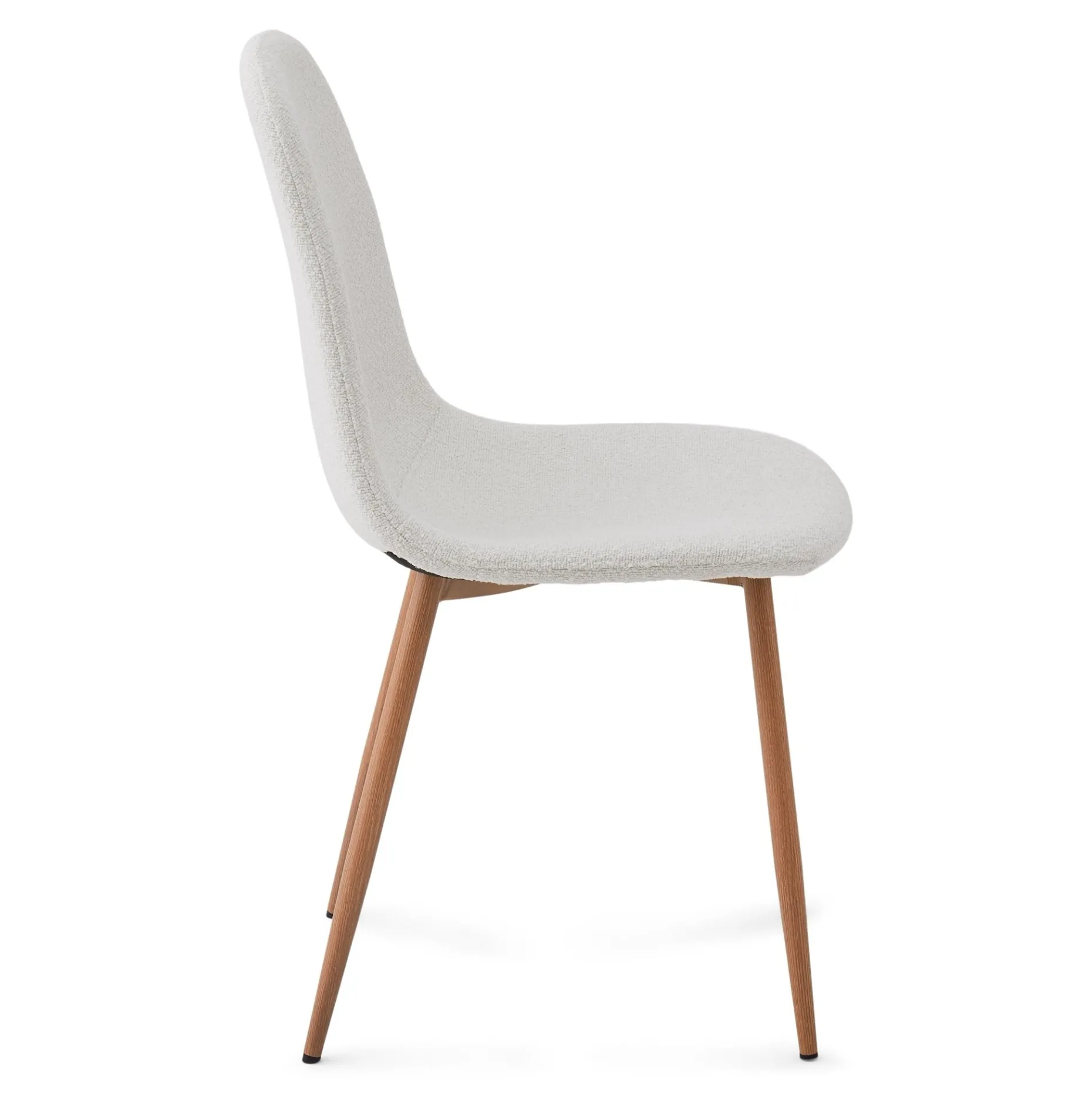 Stolen har ben i røget egelook, som giver både stabilitet og holdbarhed, mens det hvide bouclé-betræk på sædet tilfører et blødt, lyst og tidløst udtryk.