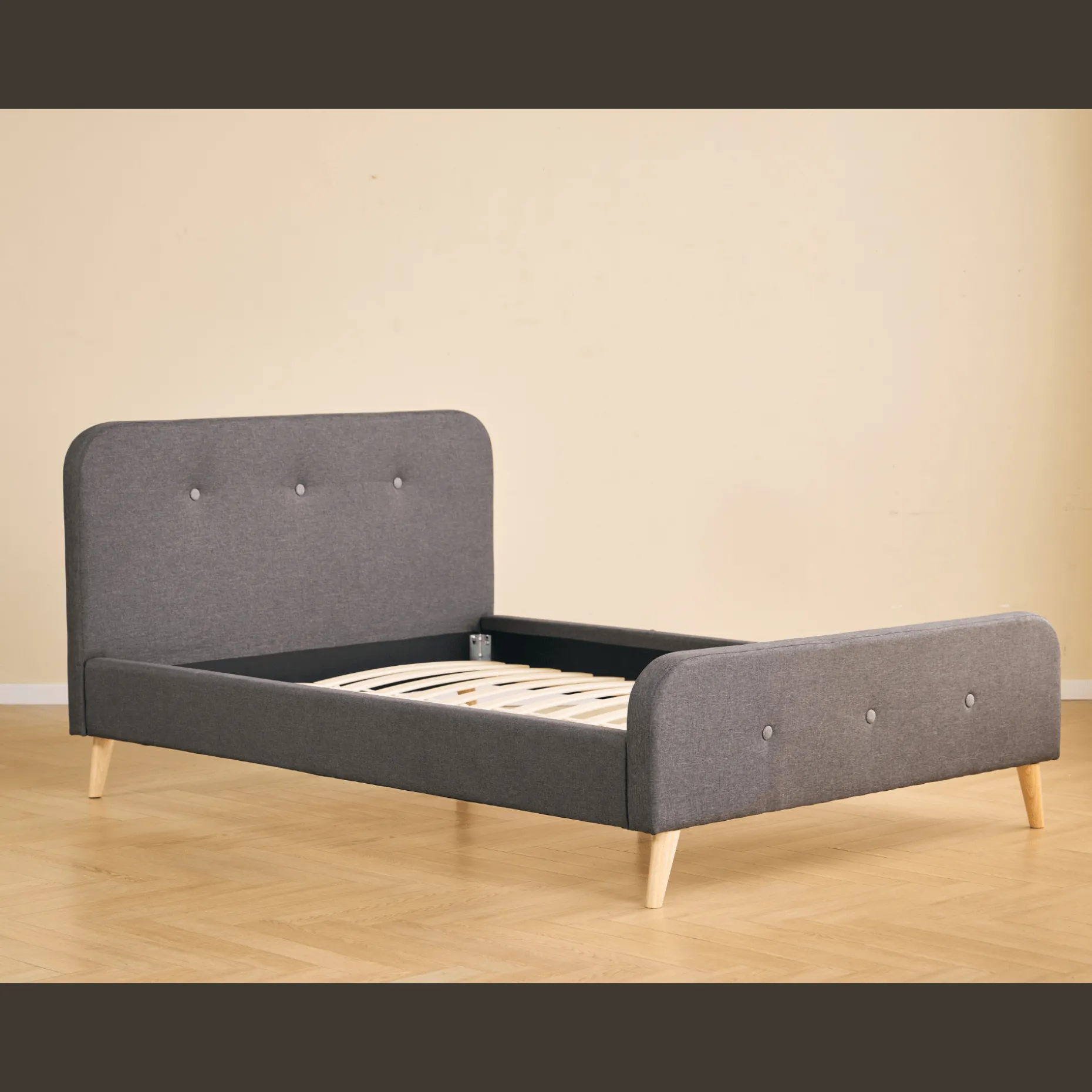 Giv dit soveværelse et stilrent og moderne udtryk med denne sengeramme med knapdetaljer. Sengerammen er betrukket med behageligt tekstil og står stabilt på solide træben, der giver et naturligt og skandinavisk præg til udtrykket.