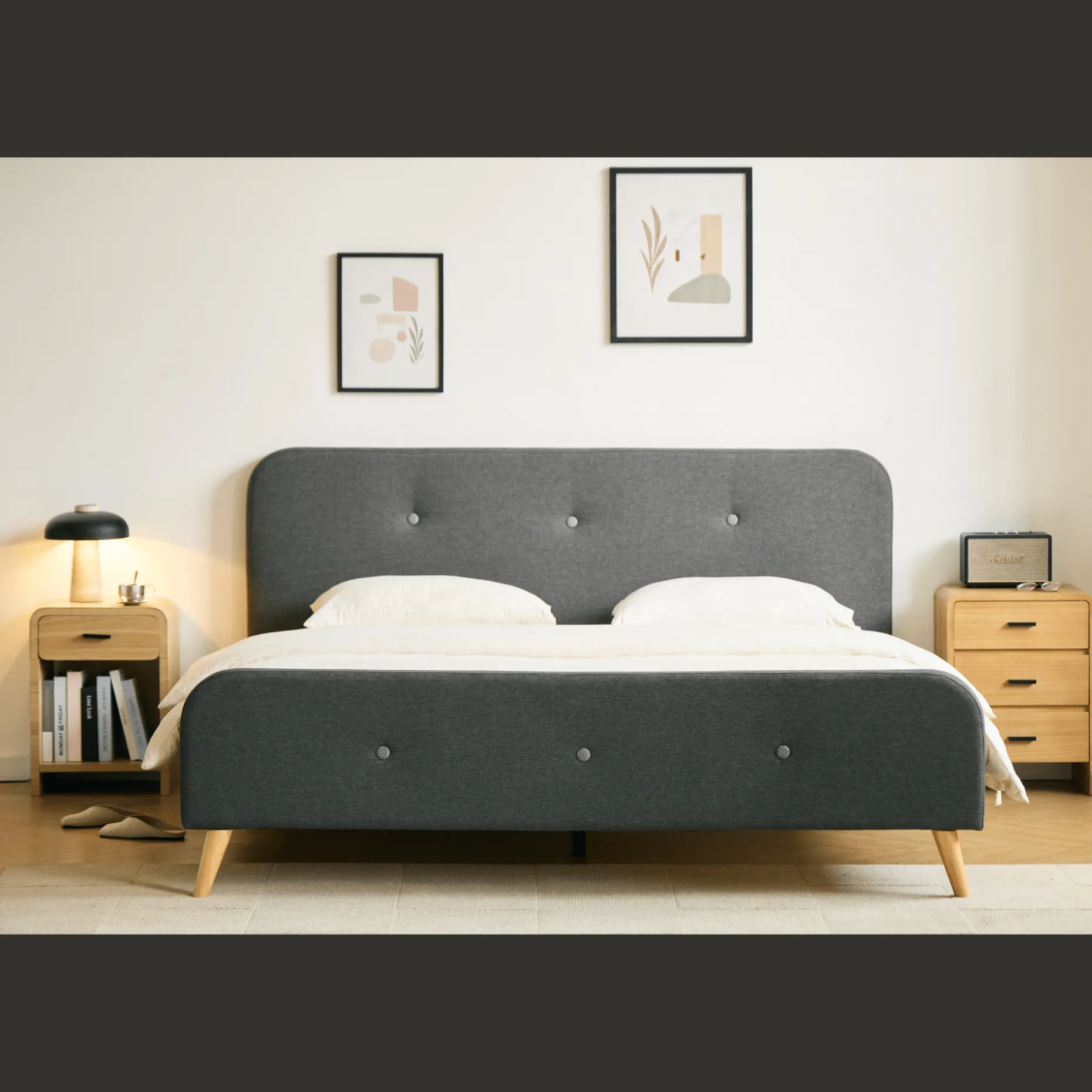 Giv dit soveværelse et stilrent og moderne udtryk med denne sengeramme med knapdetaljer. Sengerammen er betrukket med behageligt tekstil og står stabilt på solide træben, der giver et naturligt og skandinavisk præg til udtrykket.