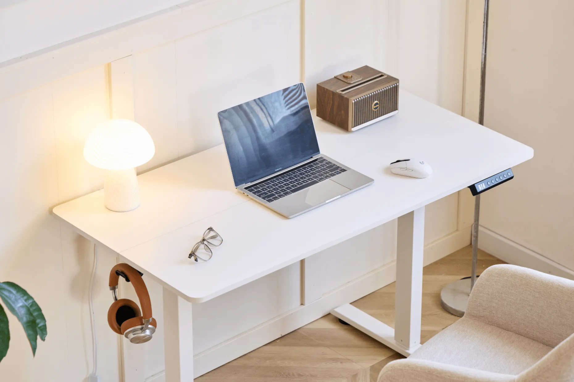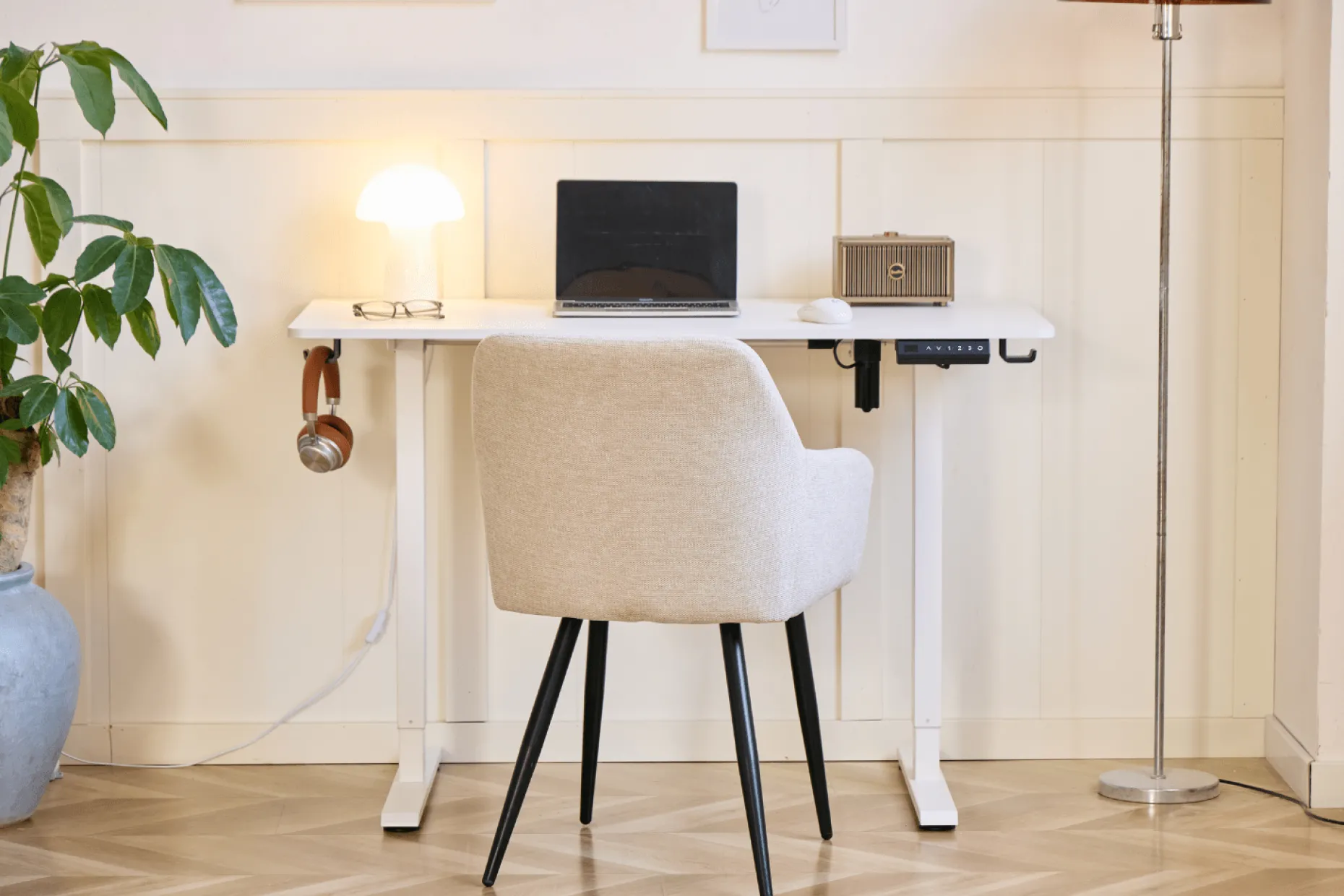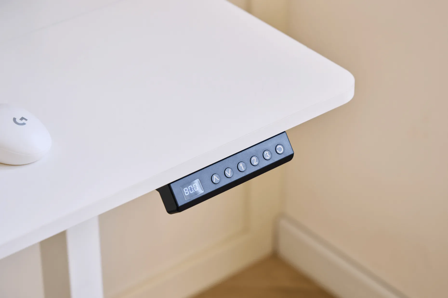 Med den støjsvage elektriske motor kan du nemt justere højden med et tryk på betjeningspanelet. Bordet justeres fra 72 til 117 cm i højden, men har også en memory funktion, hvor den husker dine 3 favorit højder. Bordet hæves og sænkes med 2 cm i sekundet. Den stabile konstruktion gør, at det står sikkert, også i den højeste position.
