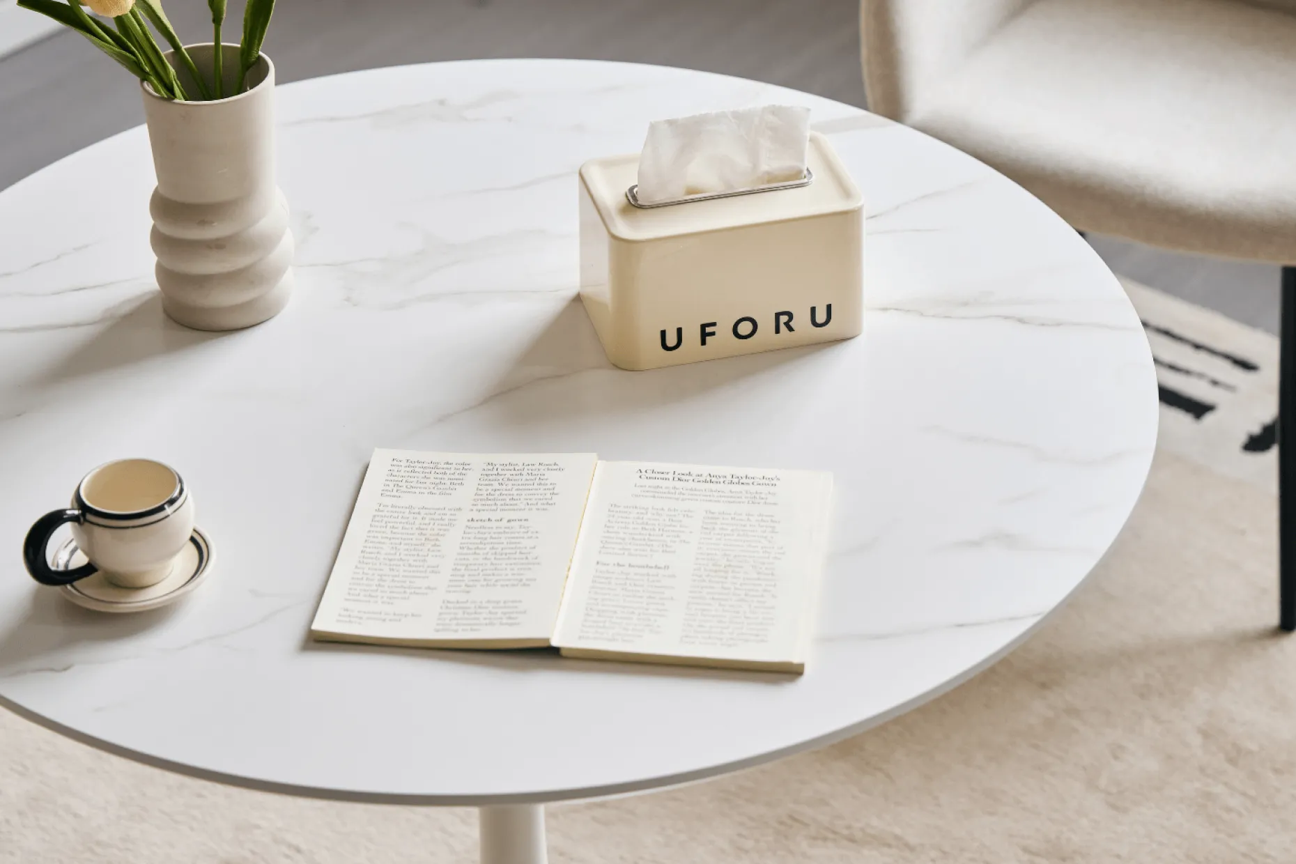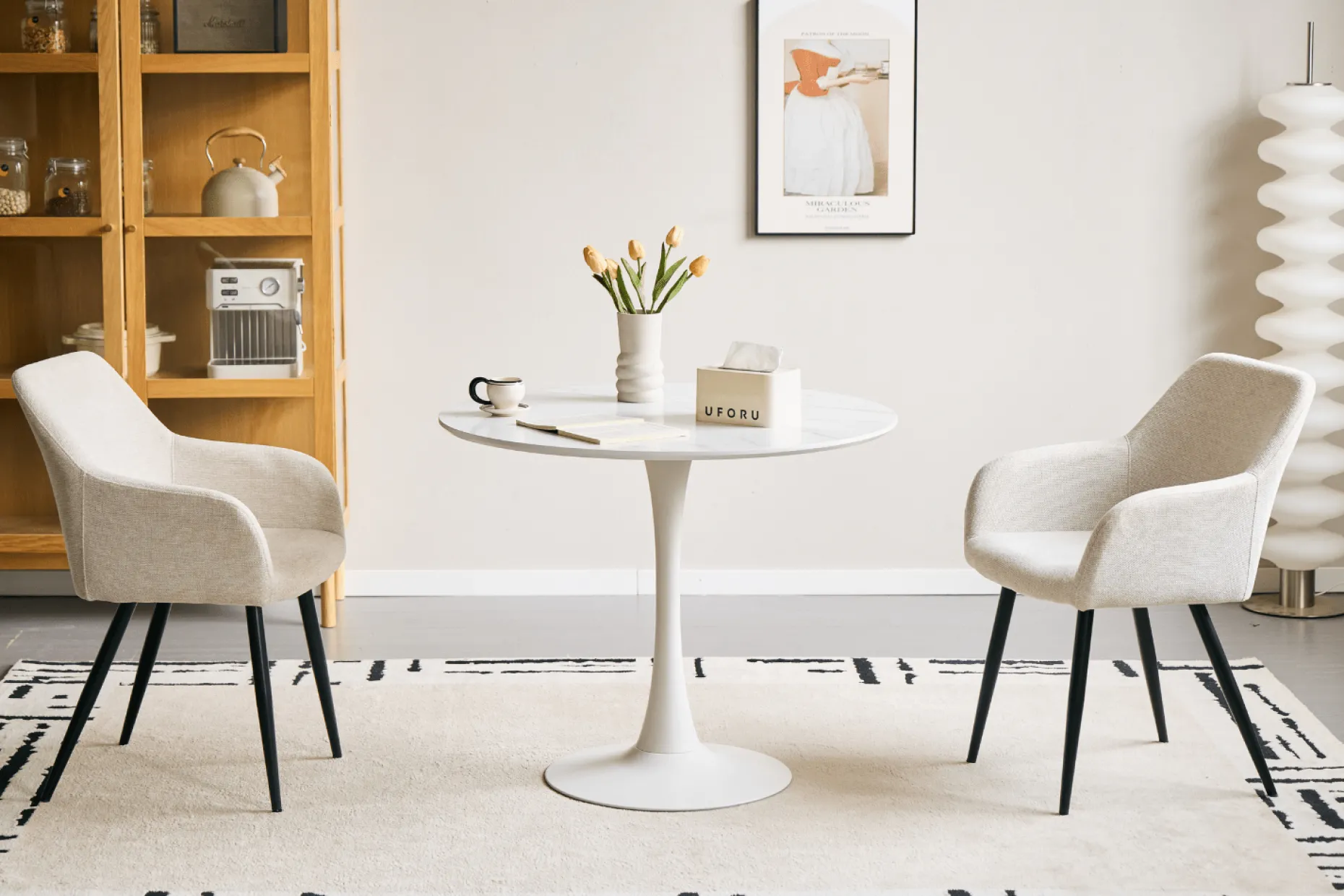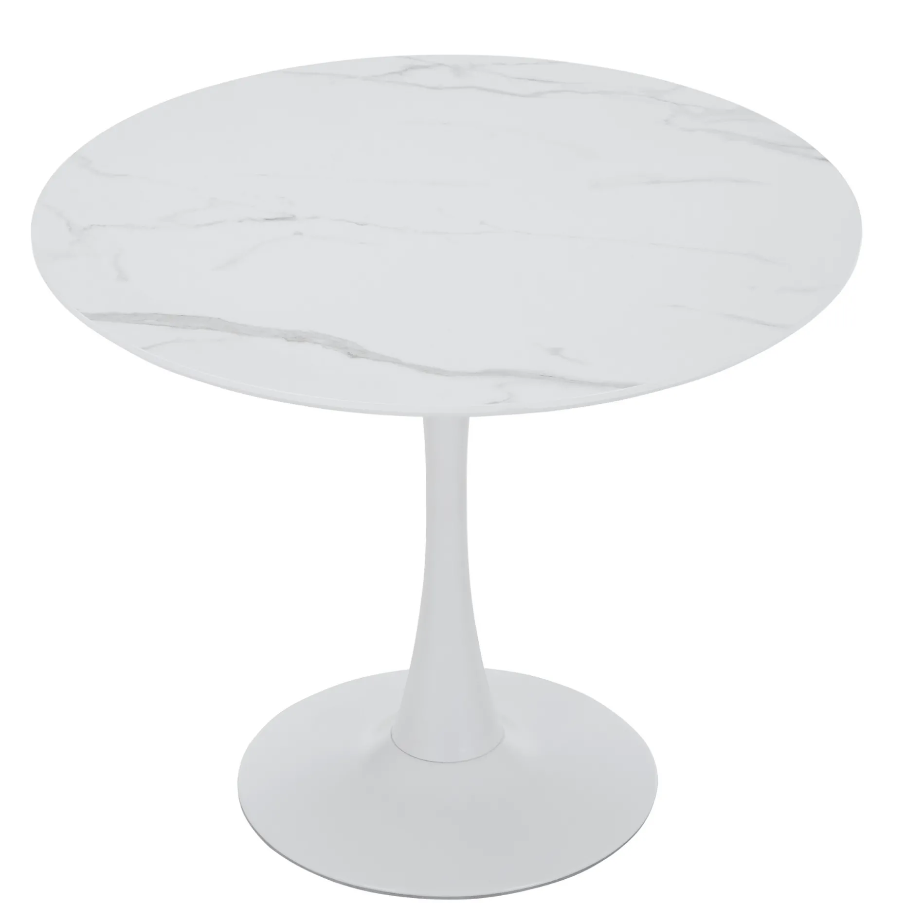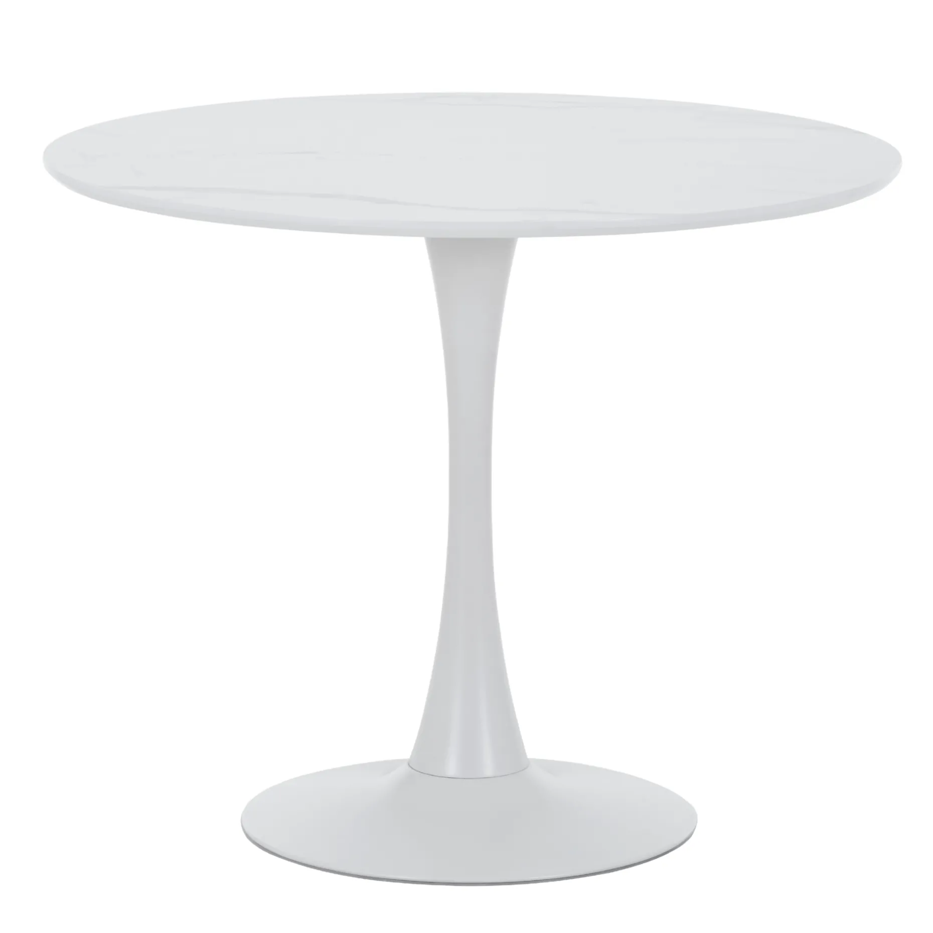 Dette elegante spisebord er det perfekte valg til mindre spisestuer og hjem, der ønsker at tilføje et strejf af luksus og stil. Bordet har en rund bordplade med hvidt marmorlook.