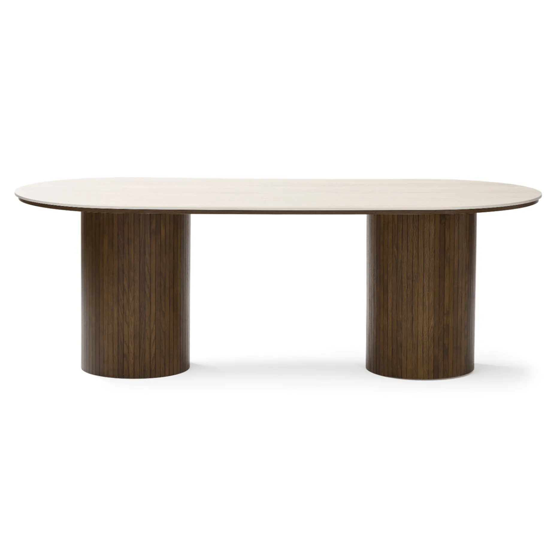 Vores Enzo spisebord med en elegant beige stenbordplade og lamelfod i røget eg er det ideelle valg til dig, der ønsker et stilrent og eksklusivt spisebord med god plads. Det ovale design skaber et let og harmonisk udtryk, som gør bordet velegnet til både større og mere åbne rum.