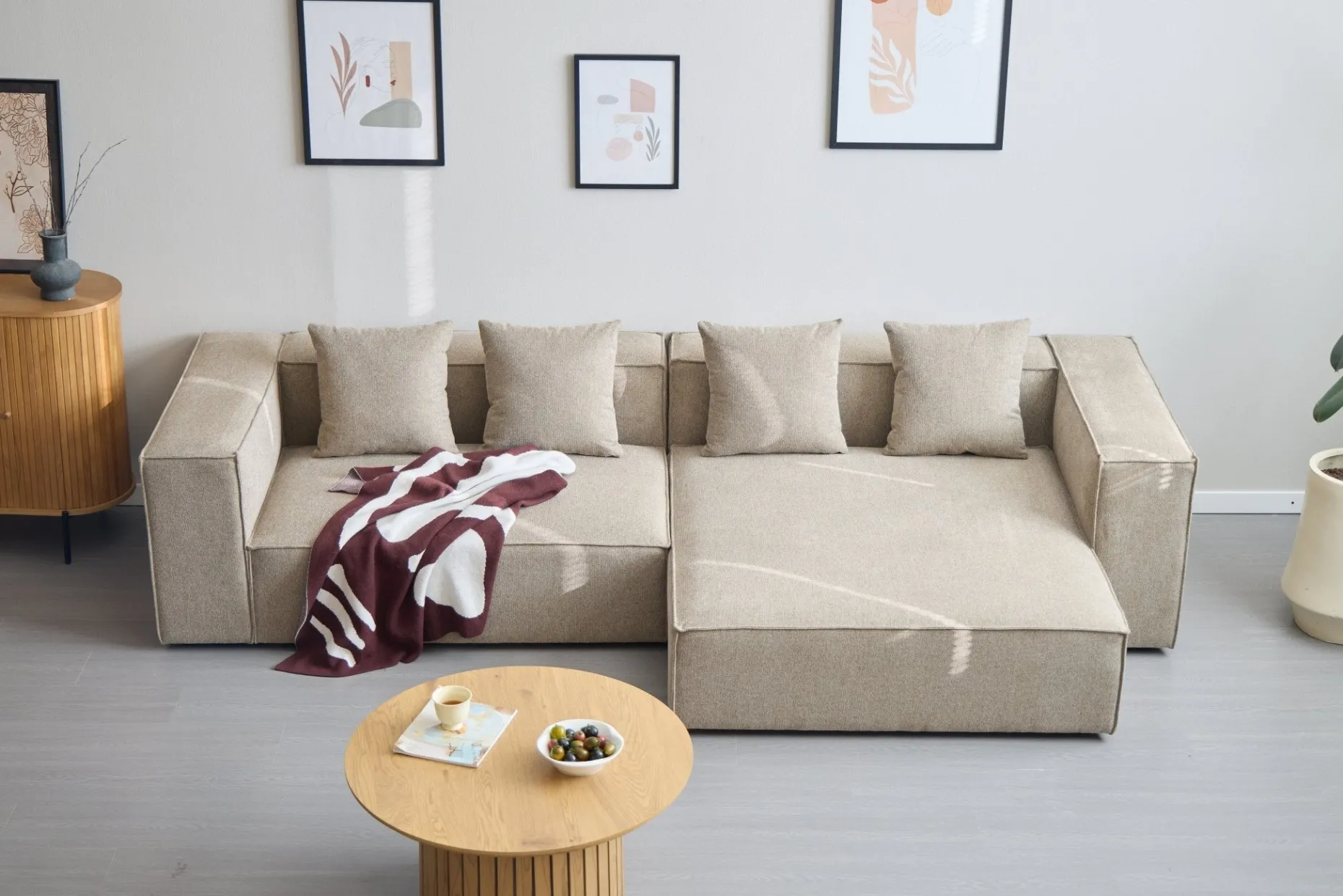 Bemærk, at sofaen leveres i moduler, der er lette at samle. Du kan nemt og frit sammensætte din sofa efter eget ønske, hvilket gør denne beige chaiselong modulsofa til et alsidigt valg for ethvert hjem.