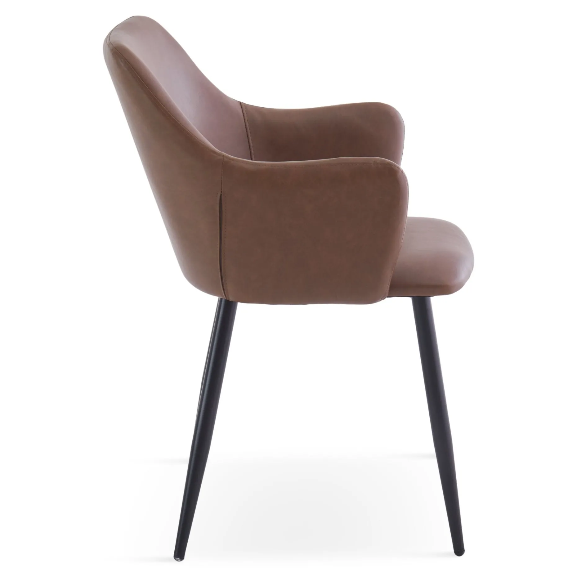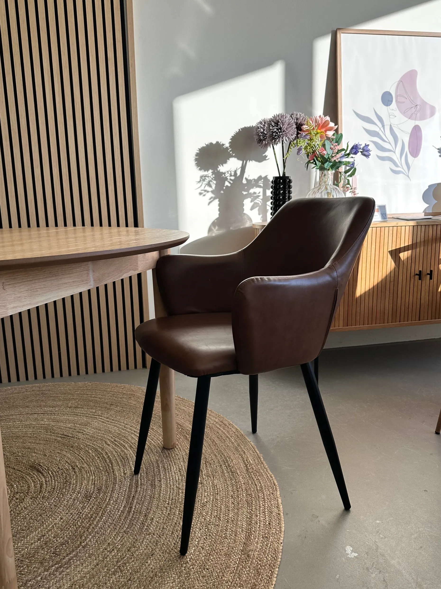 Opgrader din spisestue med vores stilfulde spisebordsstol i brunt kunstlæder. Denne stol kombinerer stil og komfort i et moderne design, der passer perfekt til både daglig brug og særlige lejligheder.