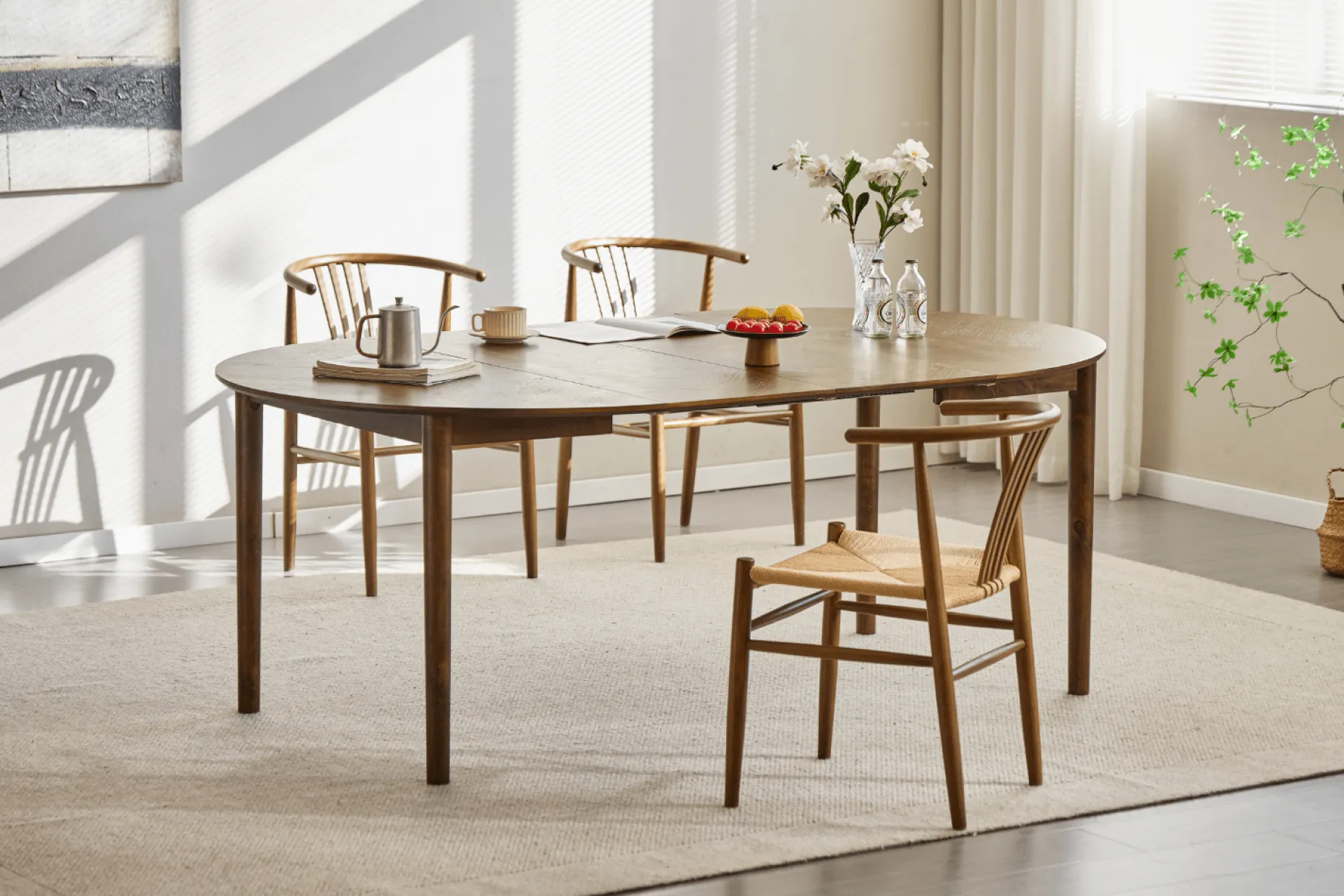 Rundt spisebord med udtræk og sildebensmønster