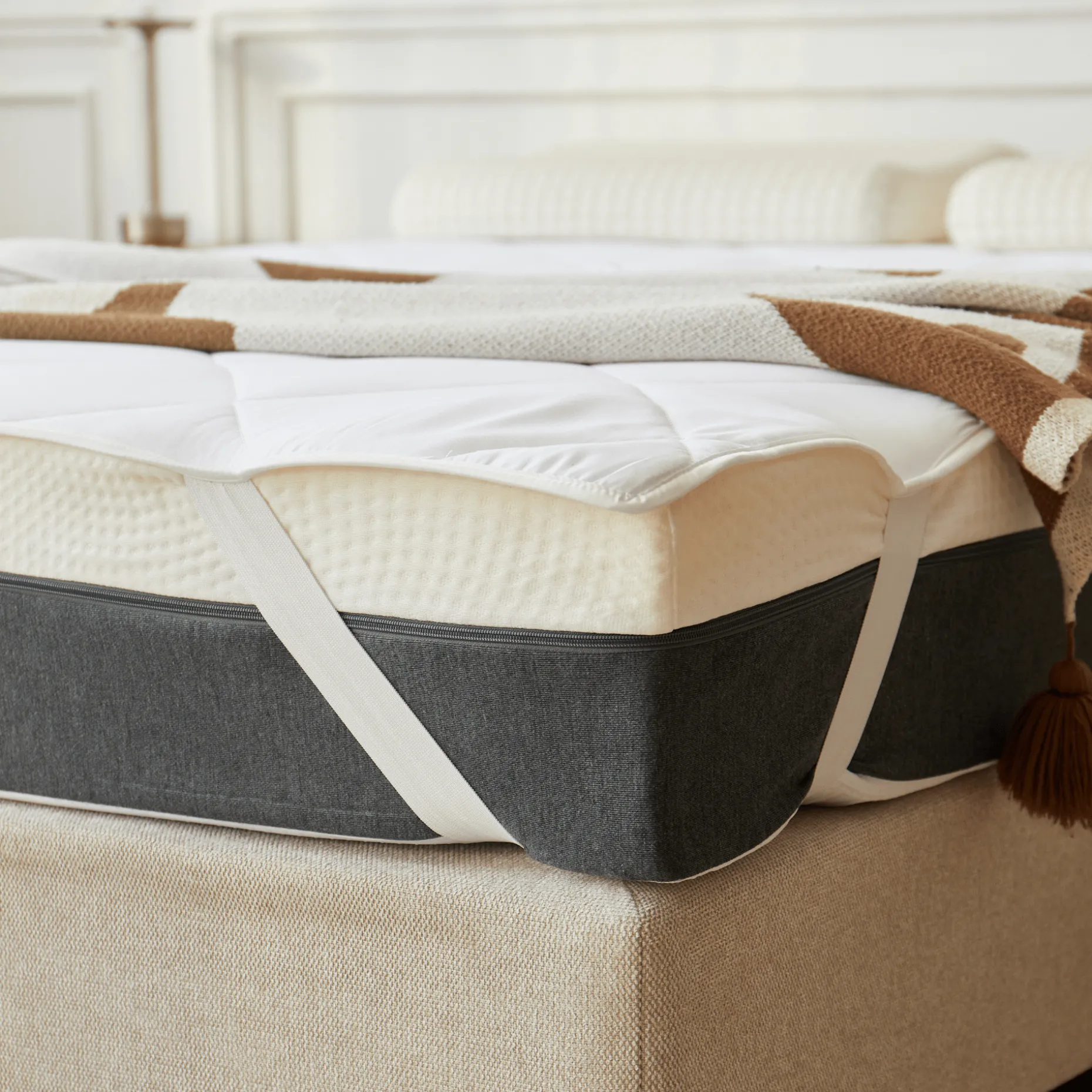| Materiale | • Polyesterfiberfyld (quiltet for jævn fordeling og formstabilitet) • Elastikstropper i hjørnerne (sikrer korrekt placering) |