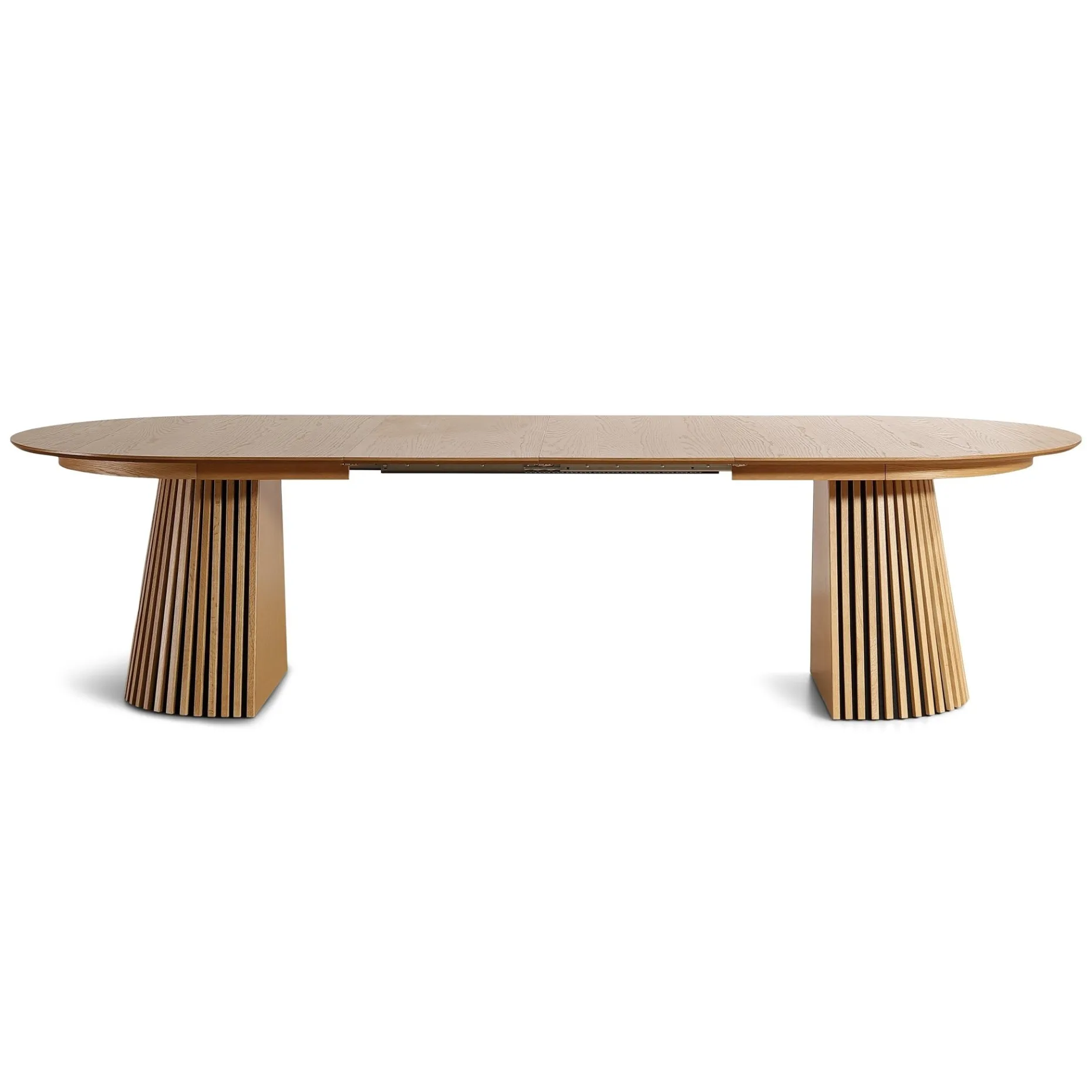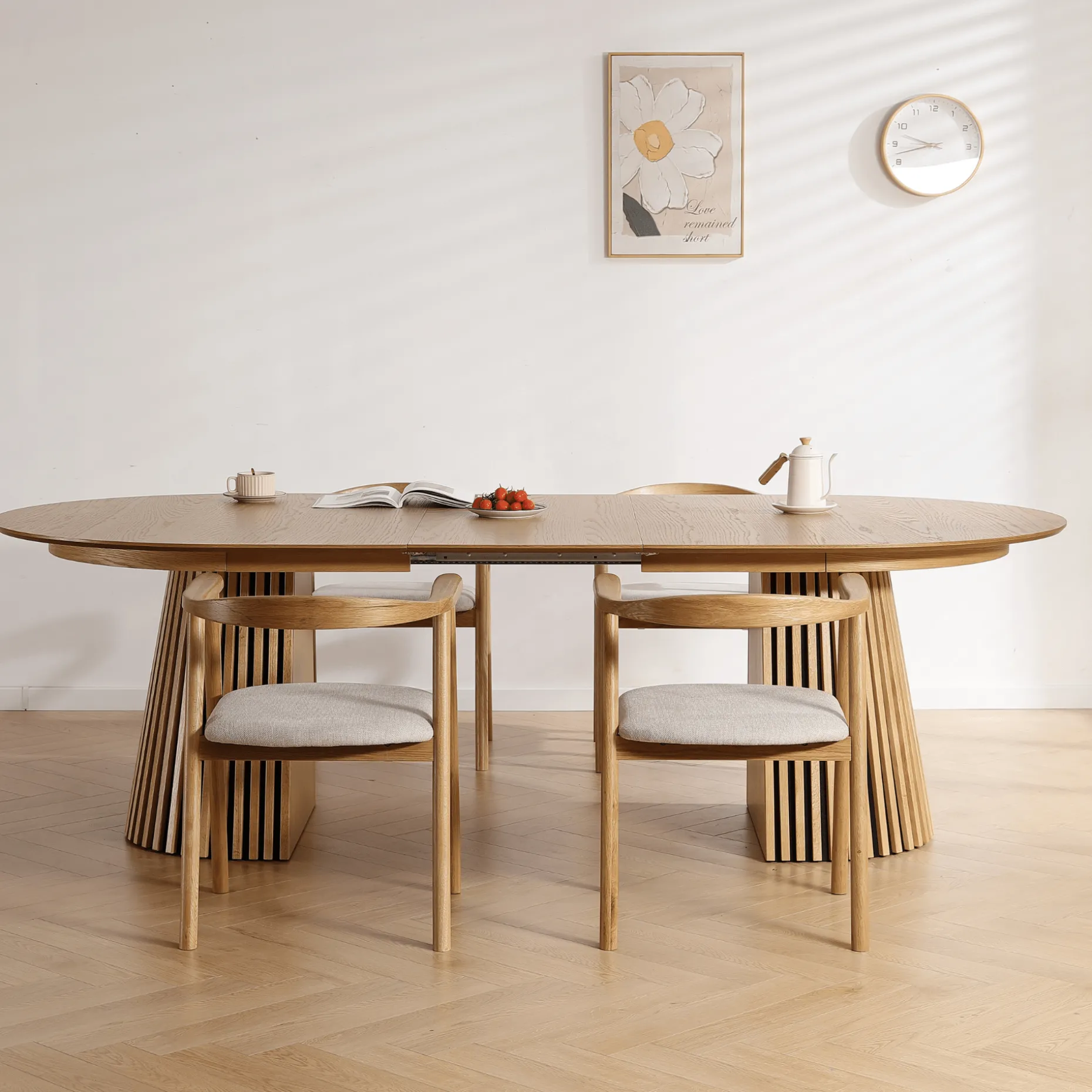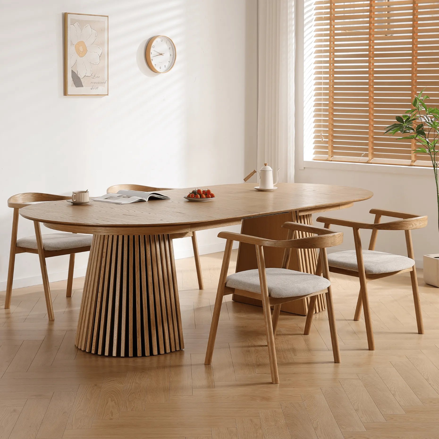 Det her bord rammer en perfekt balance mellem stil og funktion. Den ovale bordplade i egefiner giver et blødt og indbydende udtryk, mens de markante lamelfødder sætter et moderne og karakterfuldt præg på rummet.