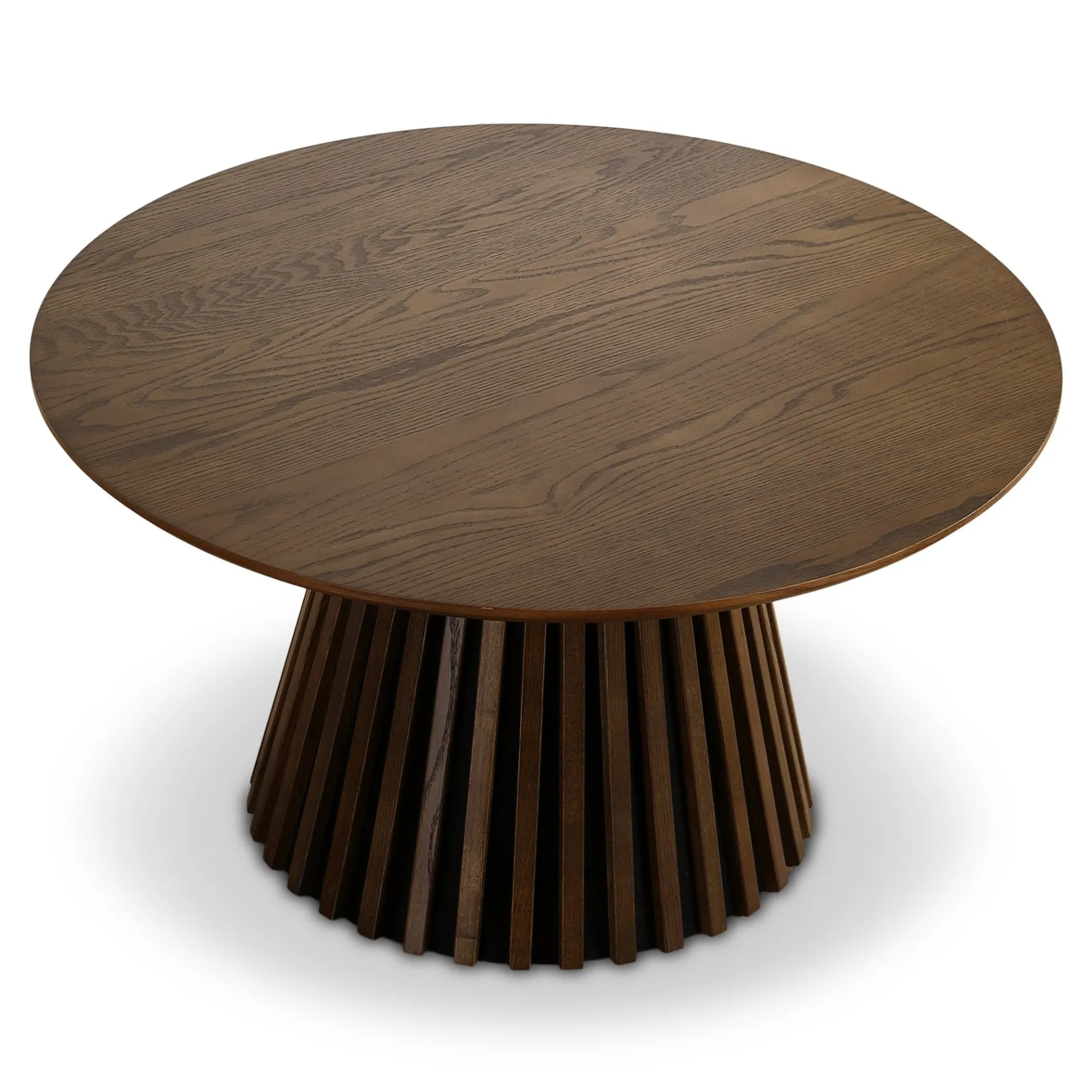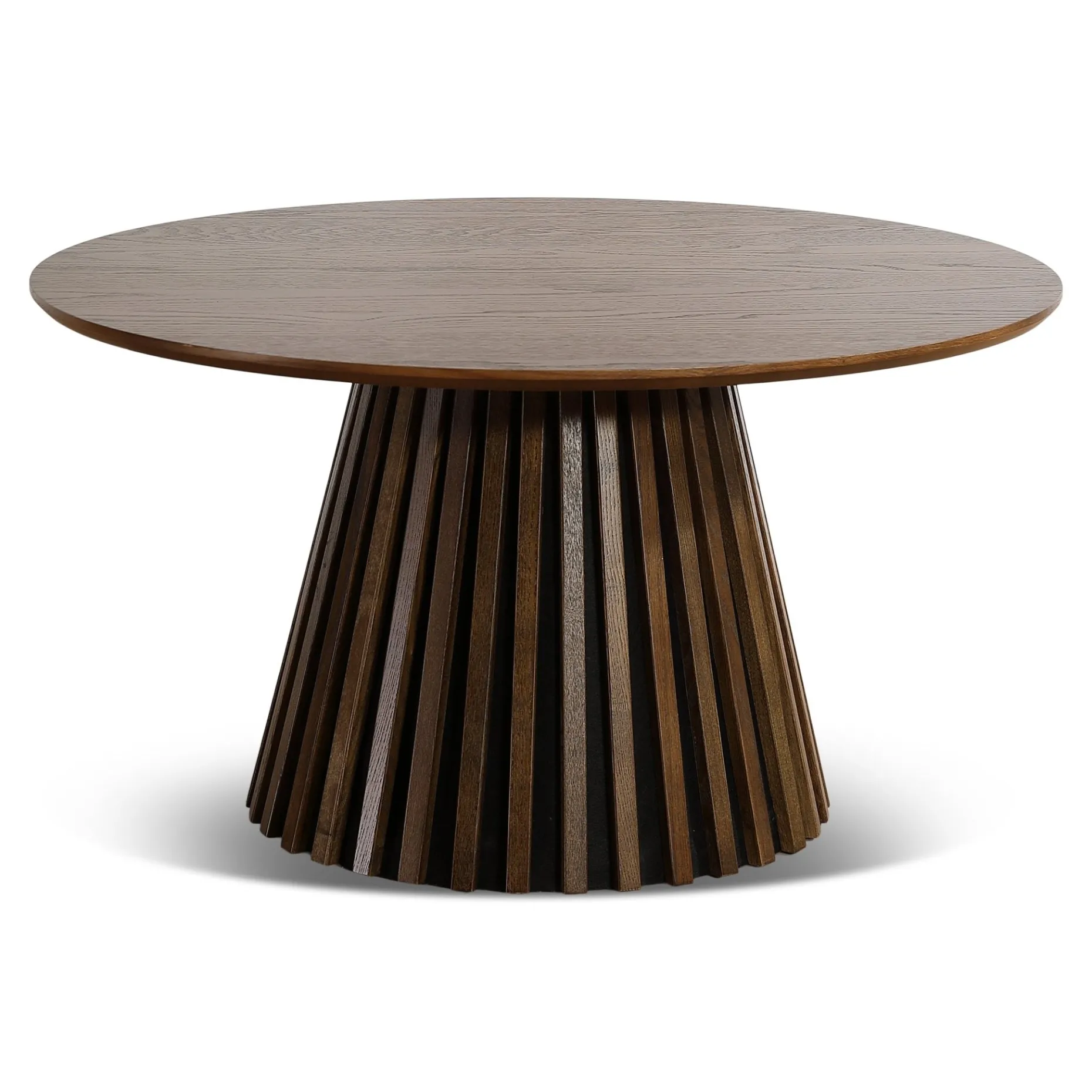 Den runde bordplade i egefiner giver et blødt og indbydende udtryk, mens den karakteristiske lamelfod giver et moderne præg.