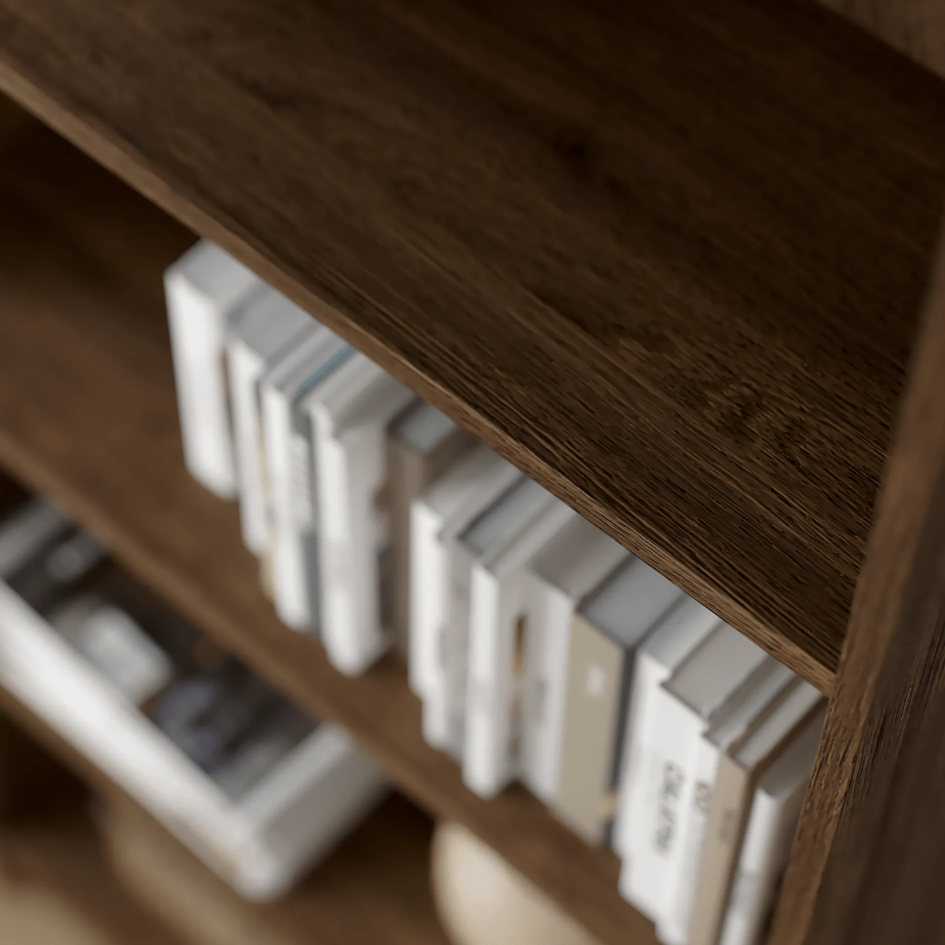 Opgrader dit hjem med denne stilrene og alsidige reol, der kombinerer funktionalitet med et tidløst design. Det åbne udtryk og det røget træfinish gør reolen nem at integrere i både moderne og klassiske indretninger, uanset om den placeres i stuen, kontoret, soveværelset eller entréen.