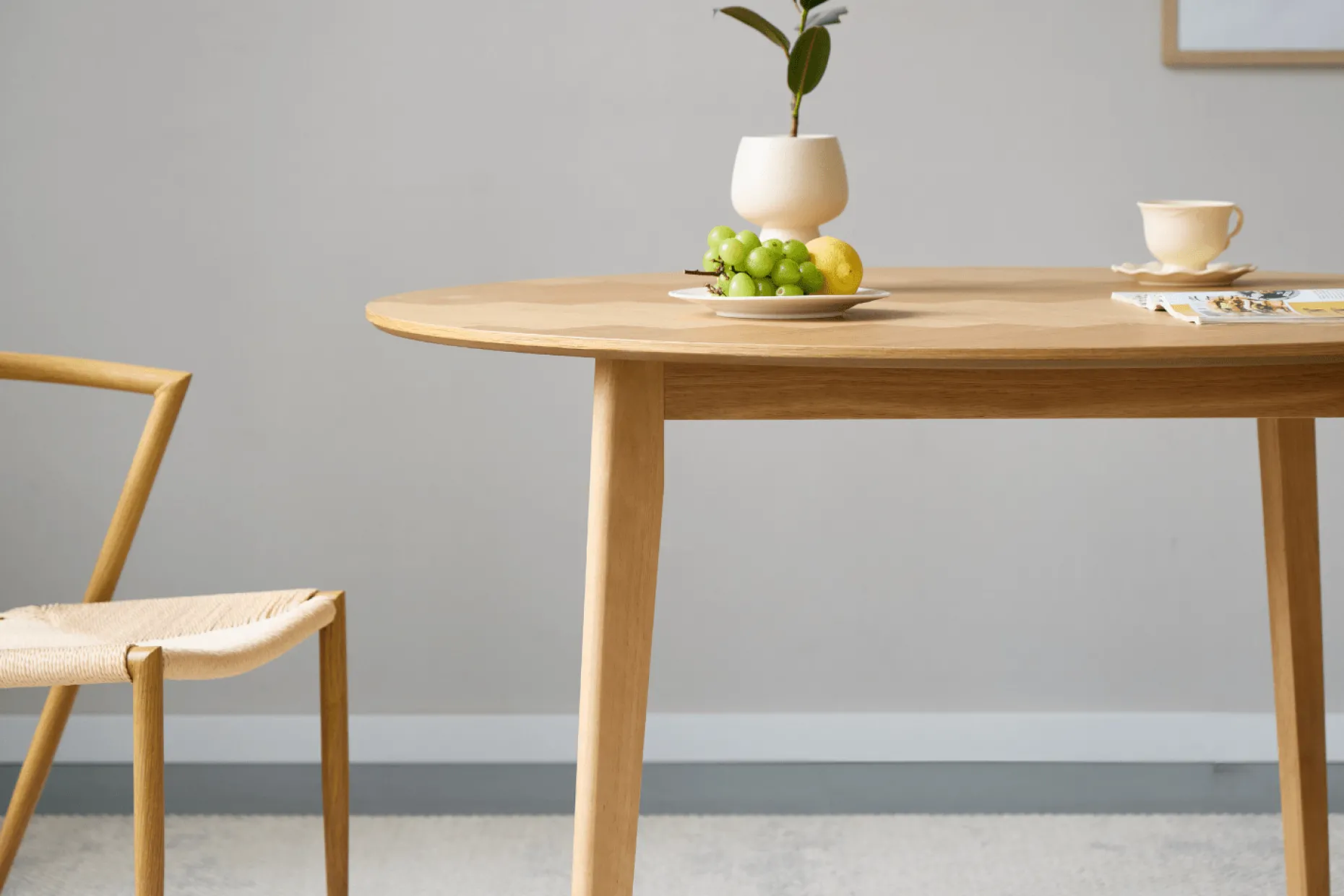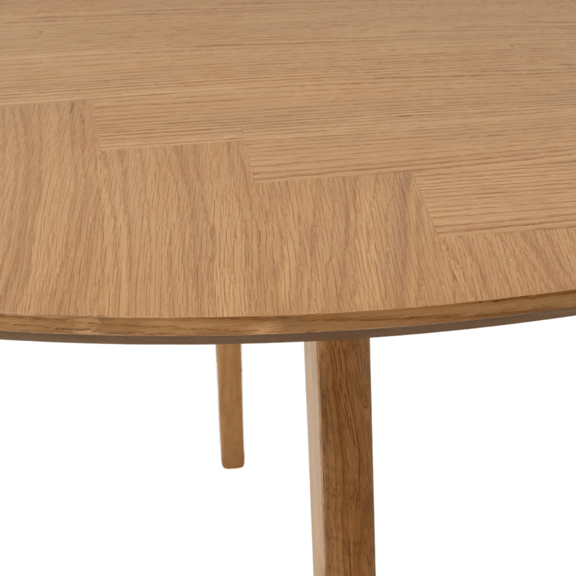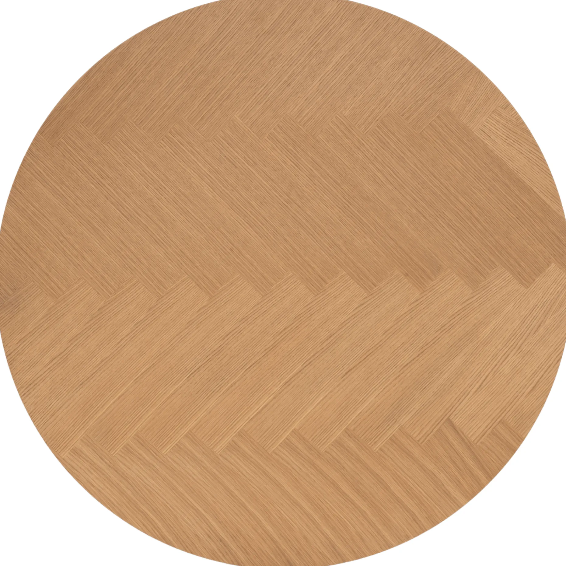 Et elegant og tidløst rundt spisebord med flot sildebensmønster, der giver bordpladen karakter og et eksklusivt udtryk. Med en diameter på 120 cm er der god plads til hyggelige måltider og nærvær med familie og venner.