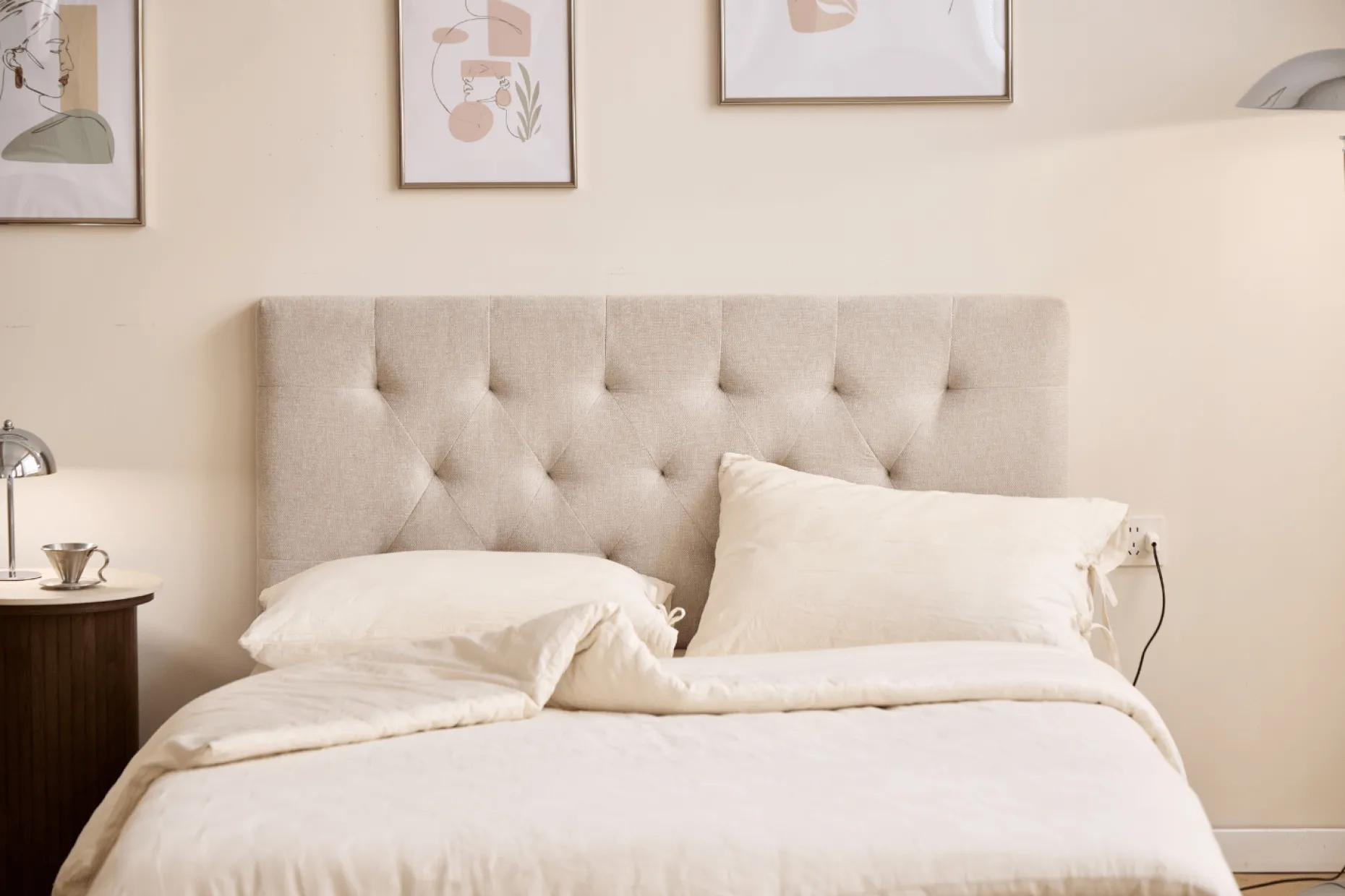 Denne smukke sengegavl i beige tekstil tilføjer et elegant og tidløst touch til dit soveværelse. Med sine delikate tuftede detaljer skaber den et sofistikeret look, der passer perfekt til både moderne og klassiske indretningsstile.