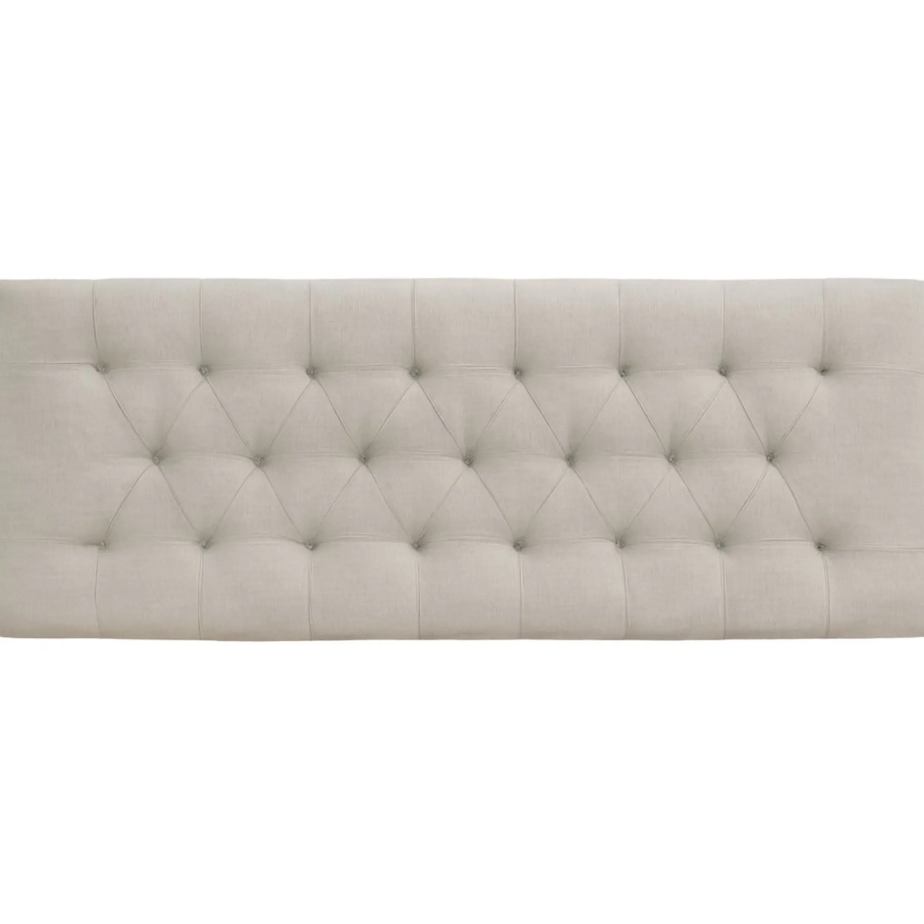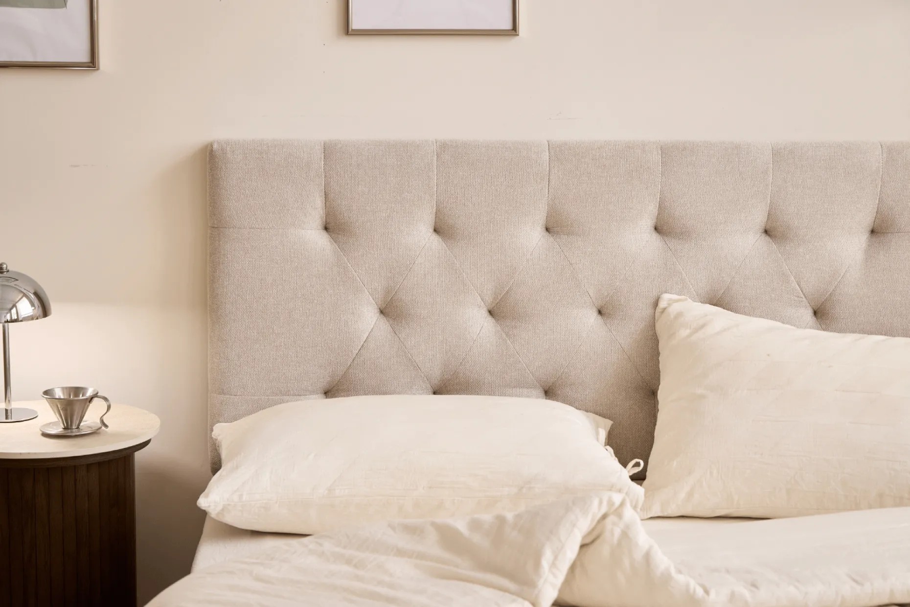 Denne smukke sengegavl i beige tekstil tilføjer et elegant og tidløst touch til dit soveværelse. Med sine delikate tuftede detaljer skaber den et sofistikeret look, der passer perfekt til både moderne og klassiske indretningsstile.
