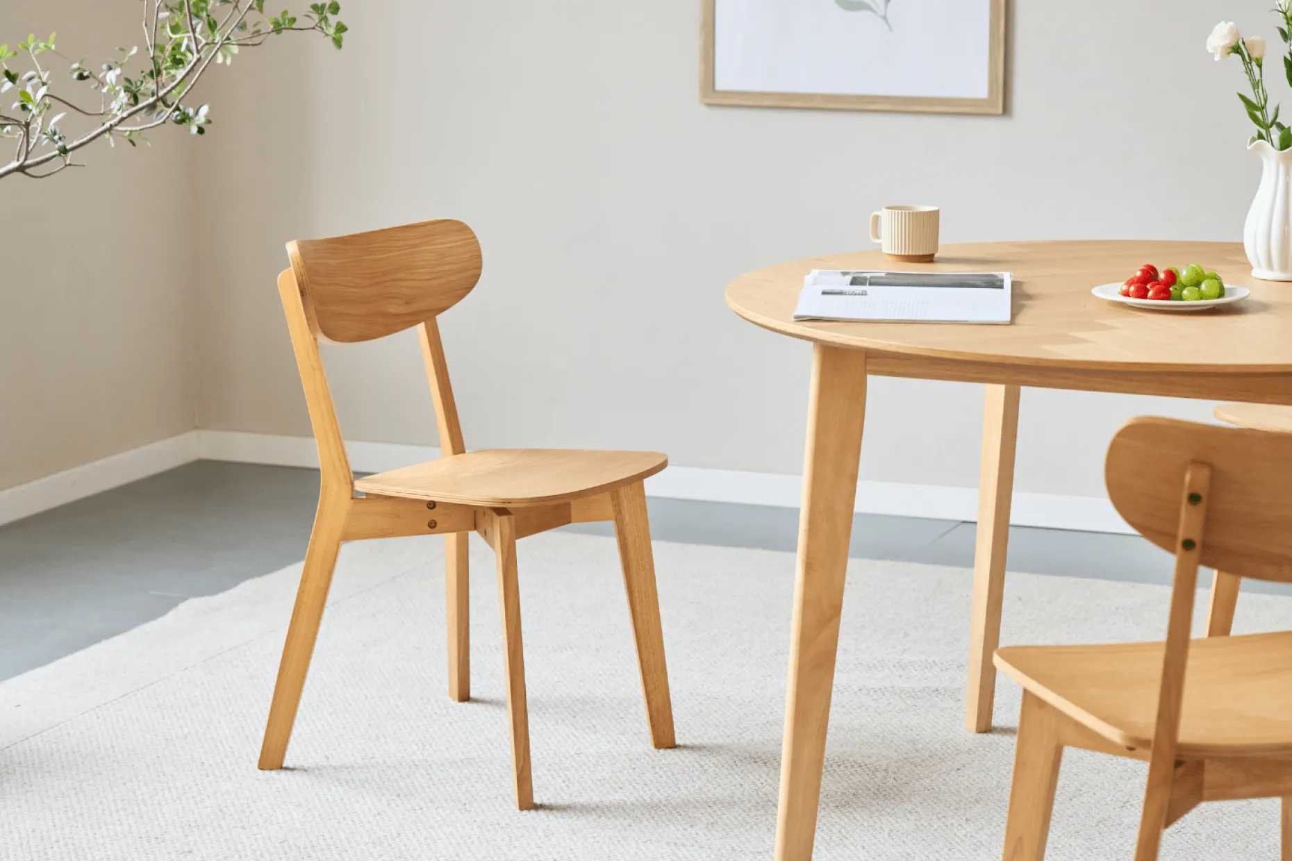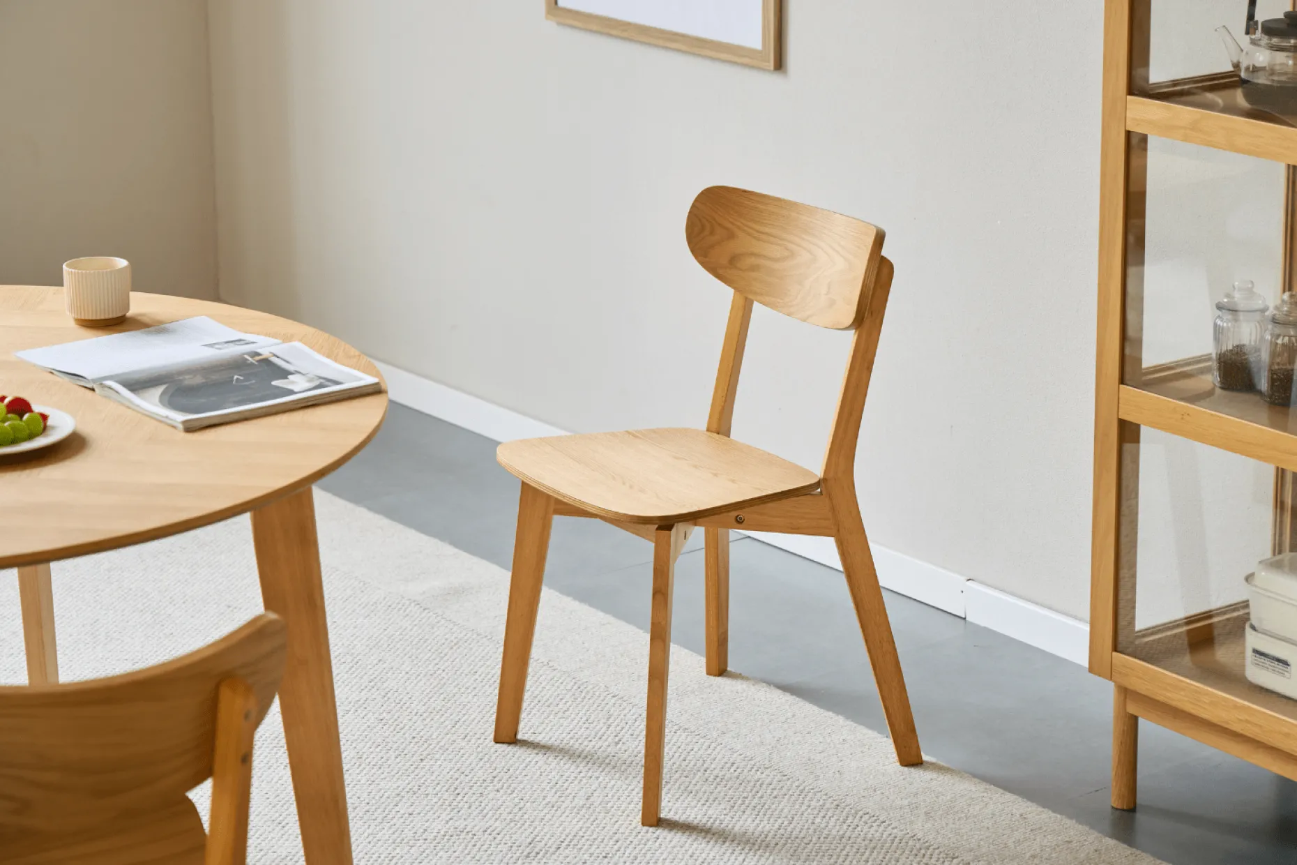 Enkel og tidløs spisebordsstol med let buet ryglæn, der giver ekstra støtte. Stolen er lavet i egefiner og har et klassisk trælook, der passer ind i både moderne og mere traditionelle hjem.
