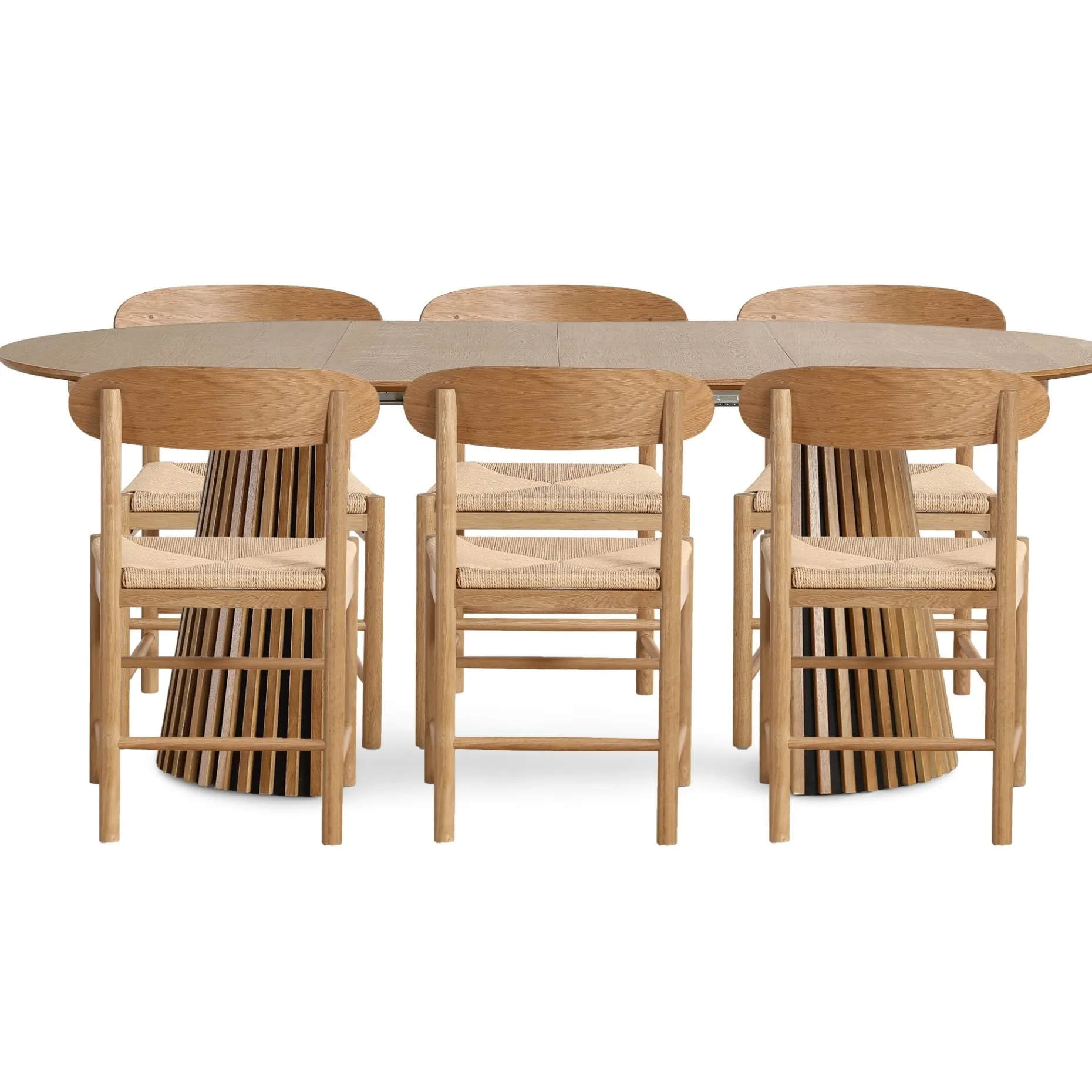 Et stilrent og praktisk spisebordssæt i varme trætoner. Lewis spisebordet er udført i naturlig egefiner og har et karakteristisk lameldesign, der tilføjer kant og karakter. Med to medfølgende tillægsplader kan bordet udvides fra 120 til hele 200 cm.