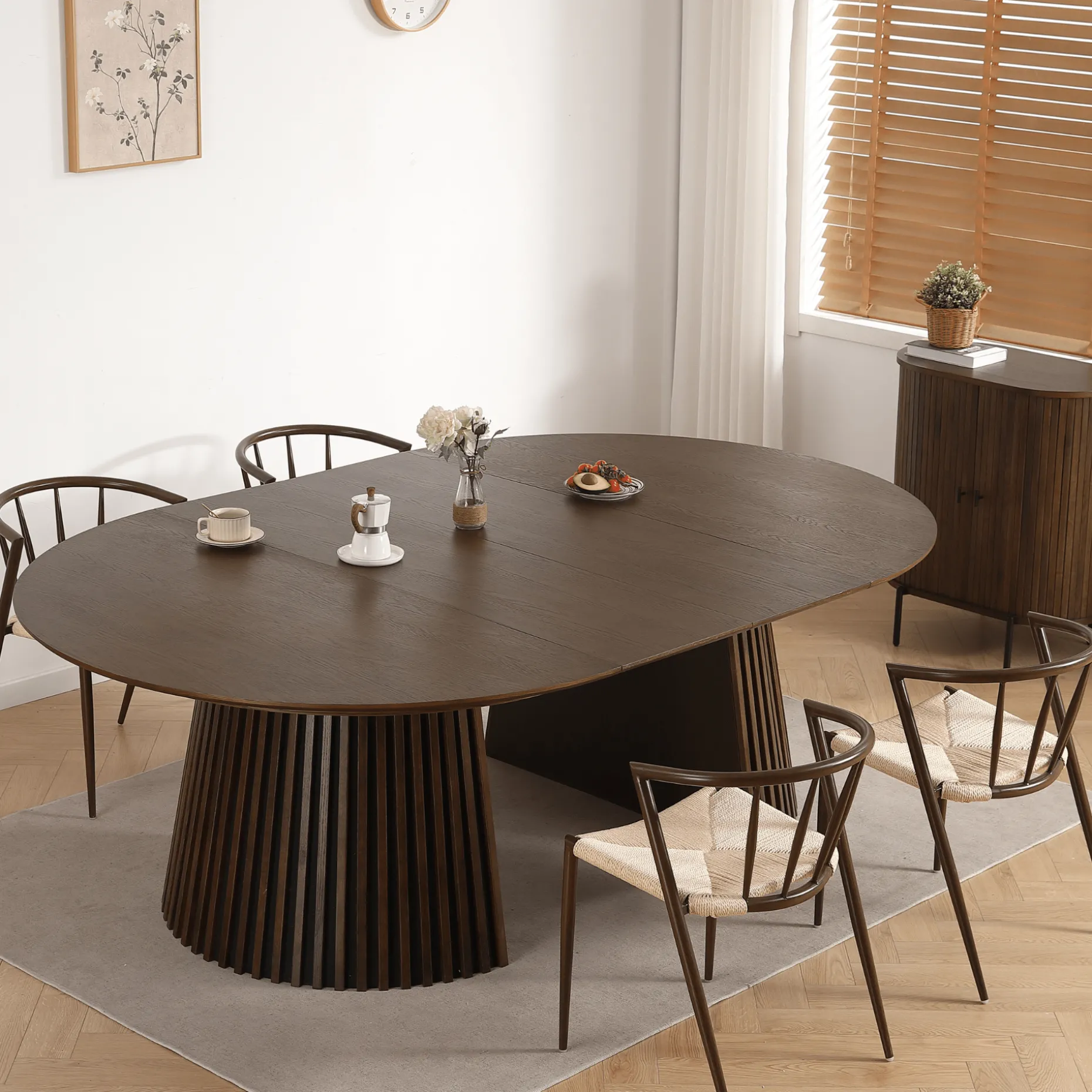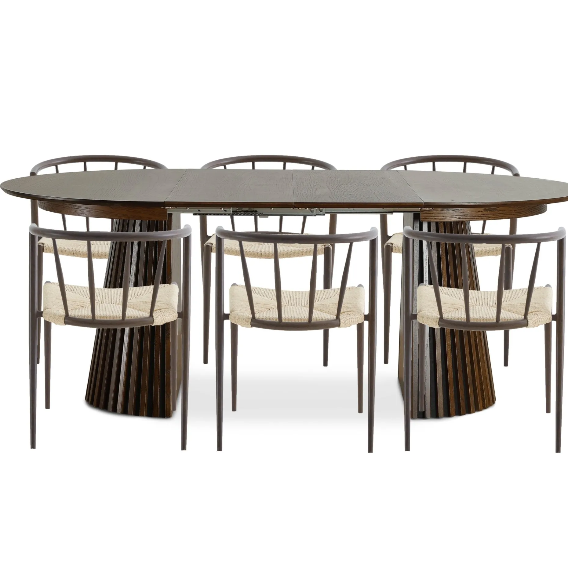 Et stilfuldt spisebordssæt, der kombinerer funktionalitet med et let og moderne udtryk. Lewis spisebordet i røget egefiner har en diameter på 120 cm og kan nemt udvides til 160 eller 200 cm med de to medfølgende tillægsplader – perfekt til både hverdage og gæstemiddage.