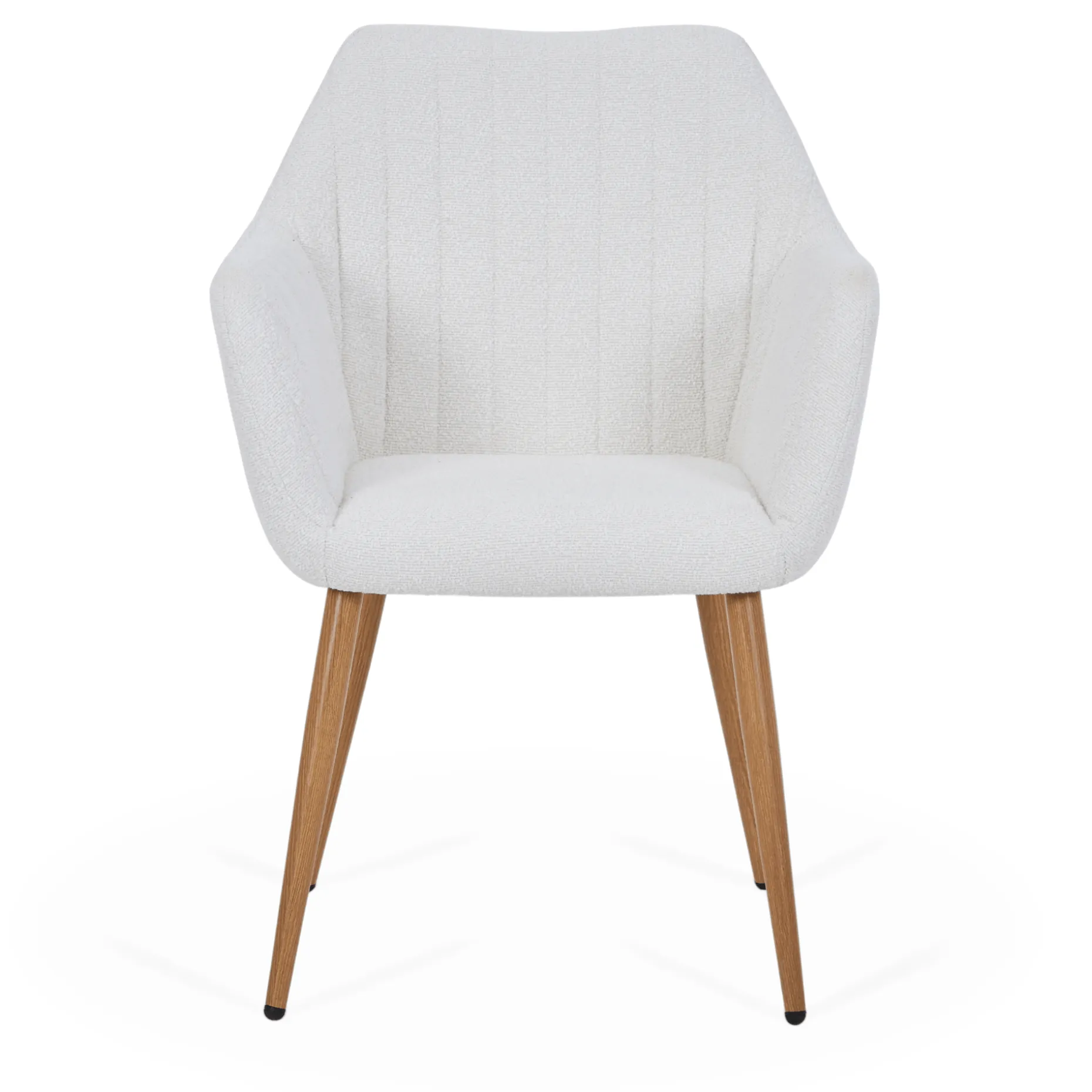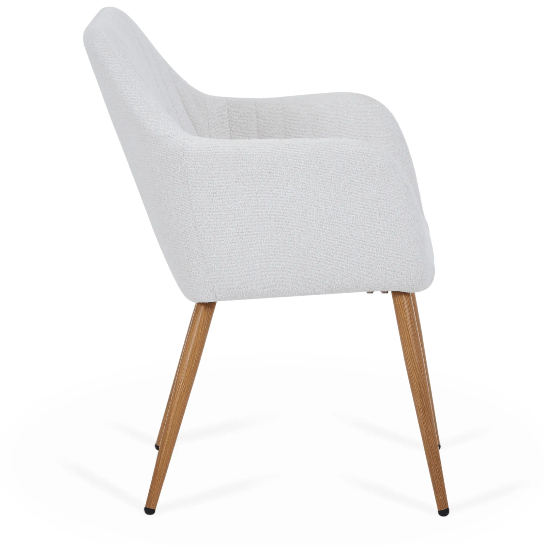 Vanessa spisebordsstol i hvidt boucle med armlæn er en smuk og komfortabel stol, der vil bringe liv og farve til ethvert spisebord eller kontor. Dens bløde hvide boucle føles lækkert mod huden, mens armlænene giver ekstra støtte og komfort. Stolens robuste stel i egelook og solid base sikrer stolens styrke og holdbarhed. Hvis du leder efter en varm og komfortabel spisebordsstol, er Vanessa spisebordsstol i hvidt boucle med armlæn et fremragende valg.